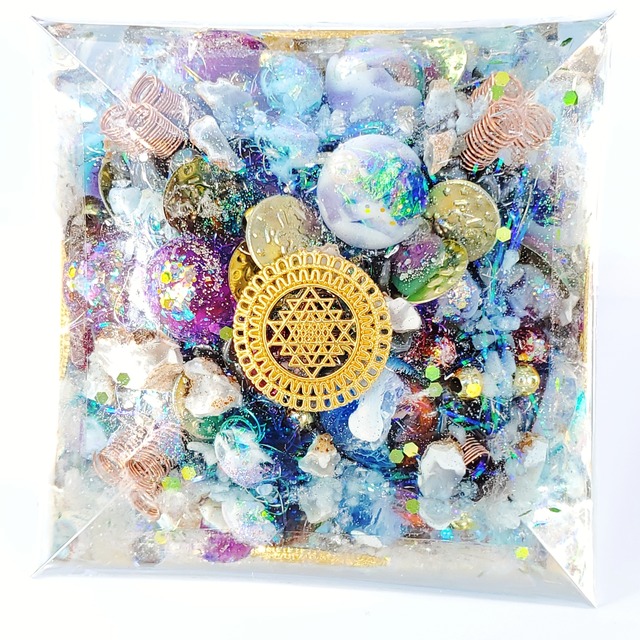 夢に出てきたホワイトピラミッドからインスピレーション受け取り、型から手作りして仕上げた黄金比率のオルゴナイト。 時代の流れが速くなり、多くの人が変化を求められ過ごしています。オルゴナイトとしての効果以外にも「魂の目覚め」「本来の自分に還る」ための変化と目覚めをサポートするよう意図して製作しました。 このオルゴナイトは、宇宙の調和と神聖なエネルギーを宿し、持つ人の進化を優しくサポートします。 宇宙を表現するフラワーオブライフの球体を先端に ホワイトの部分には水晶のポイント銅線巻き、ムーンストーン、ヒマラヤ水晶を敷き詰めています。4つの辺のラインにもポイント水晶の銅線巻きを設置しパワフルに完成しました。 一番下に球体の美しいミニオルゴナイトを敷き詰め、神聖な光と水の美しい世界をイメージして作っております。見ていると瞑想状態に入り心が落ち着き軽やかになり希望が湧いてきます。 ピラミッドを倒して底面を正面にして飾ることで新しい視点やエネルギーの流れを楽しめます。 【7つの強力なエネルギー構造】 ●フラワーオブライフ→生命エネルギーを活性化 ●ピラミッド構造→エネルギー増強、拡大、活性化 ●ムーンストーンが直感力を高め、ヒマラヤ水晶がクリアリング ●5本のポイント水晶銅線巻き→エネルギーを強化 ●底面の神聖なミニオルゴナイト→、神聖な光を放ち瞑想をサポート ●黄金比率→神聖な神の比率を用いたパワフルなピラミッド ●倒して底面を正面にすると、ヒーリングオブジェとして活用 <期待される効果> ●古い価値観を手放し、自由な新しいステージへと導く ●魂の本質に気づき、本来の自分へと還るサポート ●好奇心や直感のままに行動したいあなたをサポート ●宇宙エネルギーを受信し循環させる ●創造性とインスピレーションを引き出す 【黄金比ピラミッド】 物質界のあらゆるものを安定させ調和をもたらす比率。黄金比でできた物質はエネルギーを効率よく受信して共鳴させることができる完璧な器であり型。 【アーティストより】 夢で受け取ったメッセージ&ストーリー ~ホワイトピラミッドの中へ~ 黄金の粒が舞う白い砂へと足を踏み入れる。 頭上には、神聖なるフラワーオブライフの星 静かに歩みを進むと、砂の大地が柔らかく開き、 吸い込まれるように私を導いていく どうやらタイムラインを超えるようだ そしてたどり着いたのは、光と水の美しい世界 光り輝く美しい球体がたくさんある それは、かつての魂の記憶 あなたの神聖なる才能 ここはあなたの聖なる惑星 いつもあなたと共にある <商品仕様> 横12cm 縦12cm 高さ約7.8cm 重さ480g 【天然石】 水晶ポイント銅線巻き5本、ヒマラヤ水晶、ムーンストーン、アクアマリン、テラヘルツ鉱石、 メノウ(元乃隅神社 龍宮の潮吹き岩壁にて採掘) 【金属片】 シェイビングメタル、金属モール 【その他】 レジン、ミニオルゴナイト珠各種、コイン、金属チャーム(シュリヤントラ/ フラワーオブライフ) 【オルゴナイトとは?】 ●空間のエネルギーを整え、心身をクリアにする ●お部屋の空気を浄化し、環境の悪影響を軽減します ●電磁波が気になる方やエネルギーに敏感な方におすすめ ●ネガティブなエネルギーを変換し、自分を守るサポート ●永久半的にマイナスイオンを発生し、心身をリフレッシュ 【ご注意】 ⚠レジン製のため、経年変化で黄変する可能性あり ⚠手作りのため、表面に小さな気泡や凹凸がある場合あります。極力気を付けております。(品質には問題なし) ⚠尖った部分があるため、お取り扱いにご注意ください ⚠小さなお子様の届かない場所で保管、設置ください