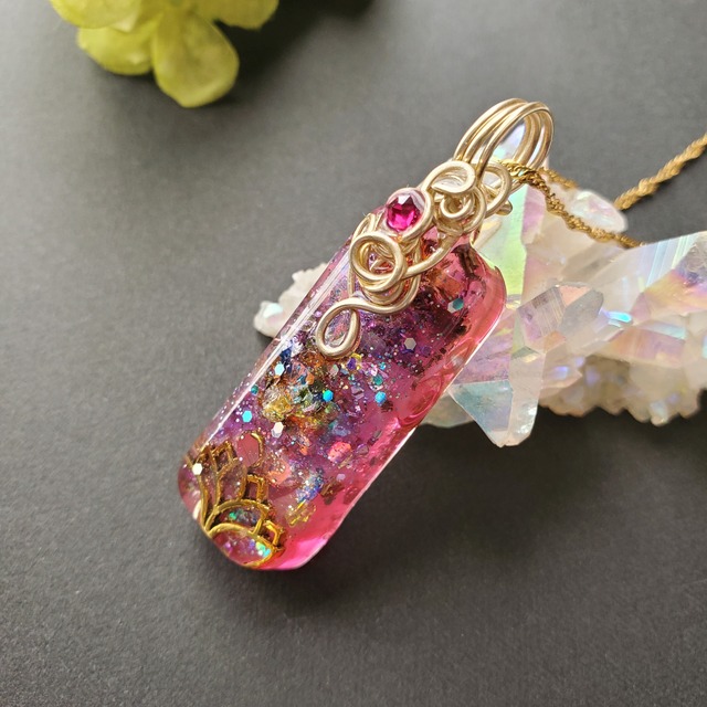 ピンクのキラキラ輝くロータス・スピリット「蓮の花の妖精」 愛の石ローズクォーツと、ポイント水晶の銅線スパイラル巻きを内包しています。普段使いにもぴったりなサイズ感で、ハートをオープンにし、愛のオルゴンエネルギーがあなたを包み込み守護します。周りの人のエネルギーに敏感な方や不快なエネルギーをもらってしまうと思っている方には特におすすめです。 【アーティストより】 内なる蓮の花を、ハートチャクラでイメージしてください。あなたの一日を、愛のエネルギーで優しく包み込みます。 <商品仕様> サイズ : トップ全体・・・全長5.6cm オルゴナイト部分 :横1.8cm×縦4cm厚み1cm 【天然石】ローズクォーツ・水晶ポイント銅線巻き 【金属片】シェイビングメタル 【その他】レジン、アーティスティックワイヤー、SWAROVSKI ※この商品はペンダントトップのみとなります。お好みのチェーンや紐を取り付けて使用ください。