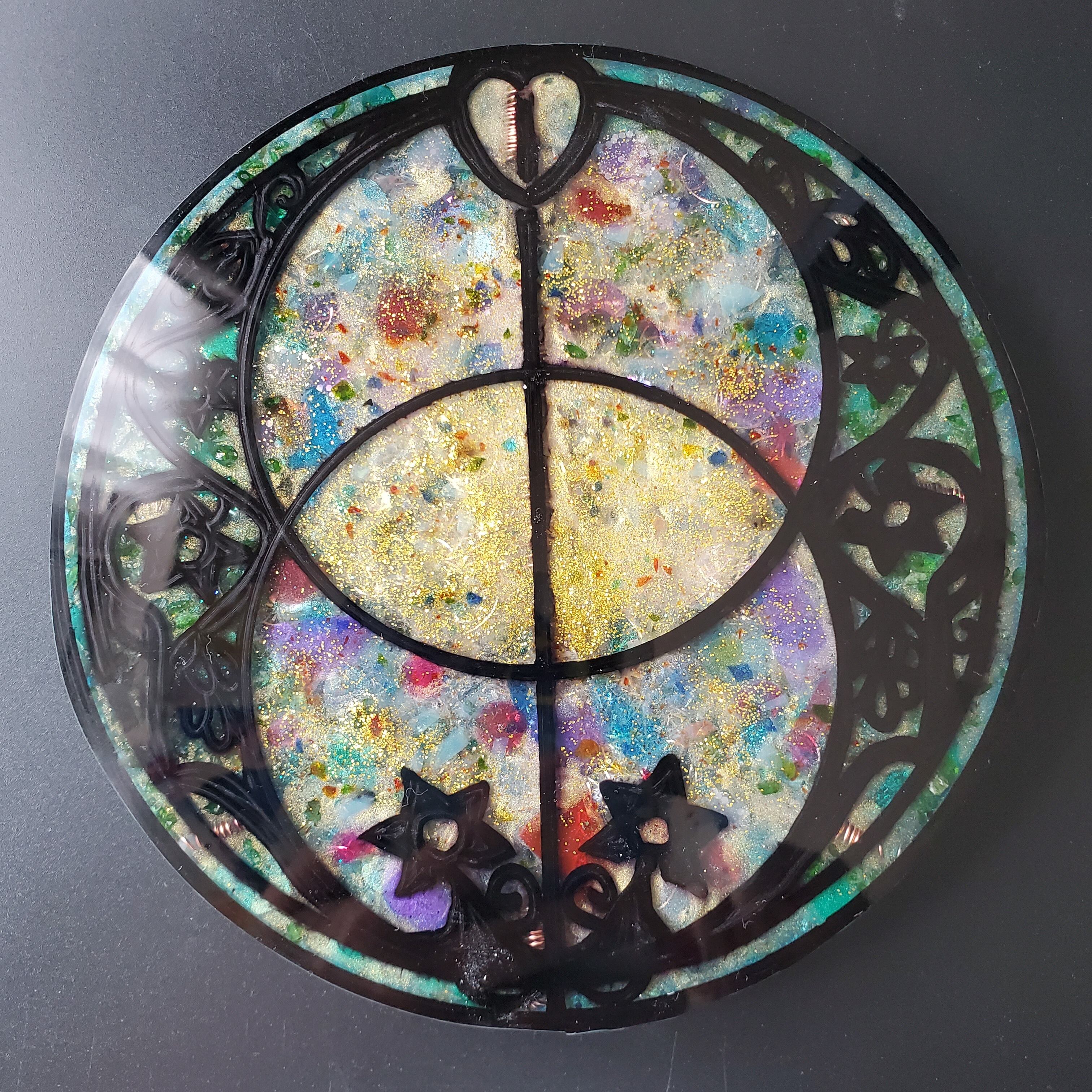 この作品はまさにチャリス・ウェル(聖なる井戸)の蓋と同じ黒で描いて作製しました。ステンドグラスをイメージしてカラフルなアンダラクリスタルのチップを敷き詰めてみました。アヴァロンやグラストンベリーに惹かれる方にもお薦めです。