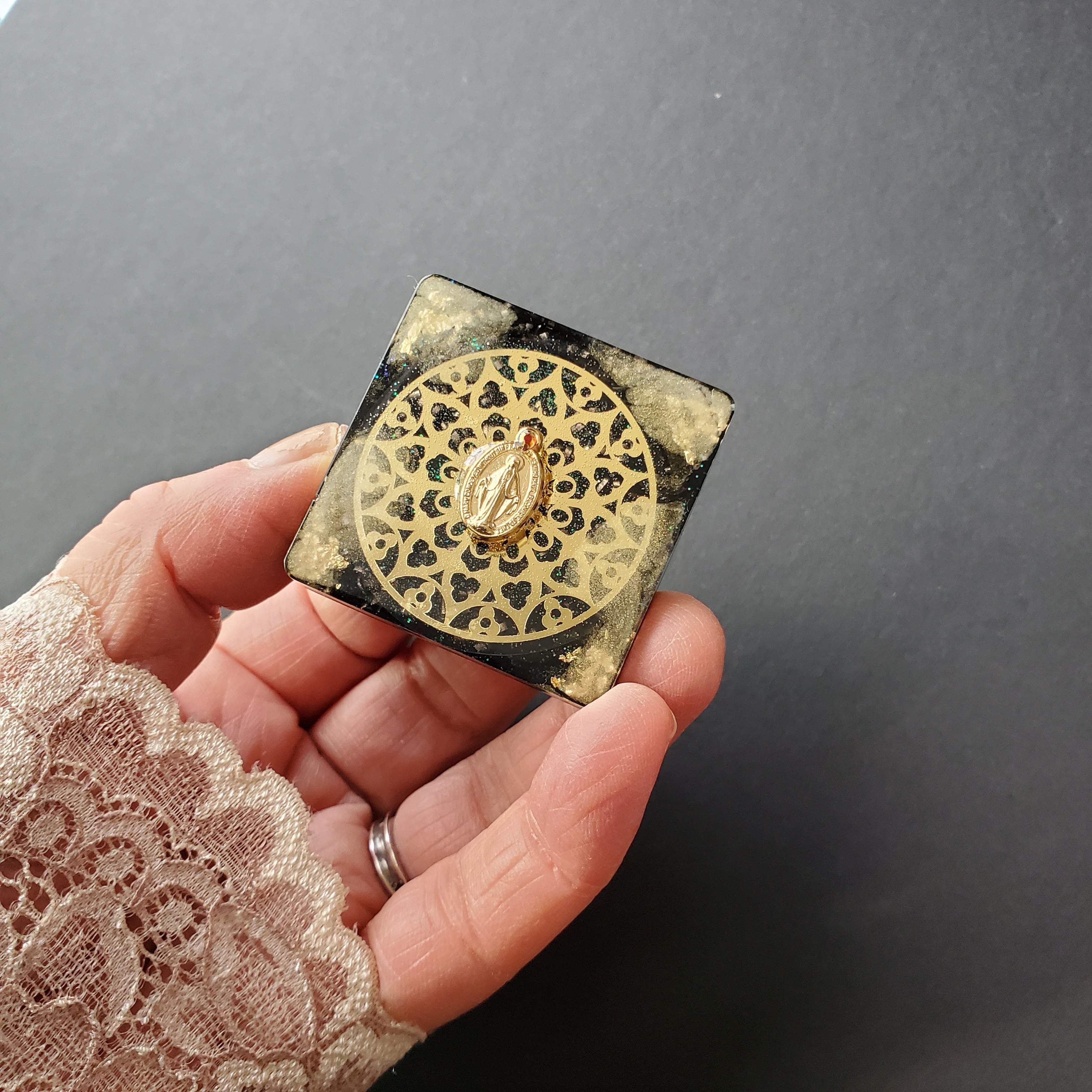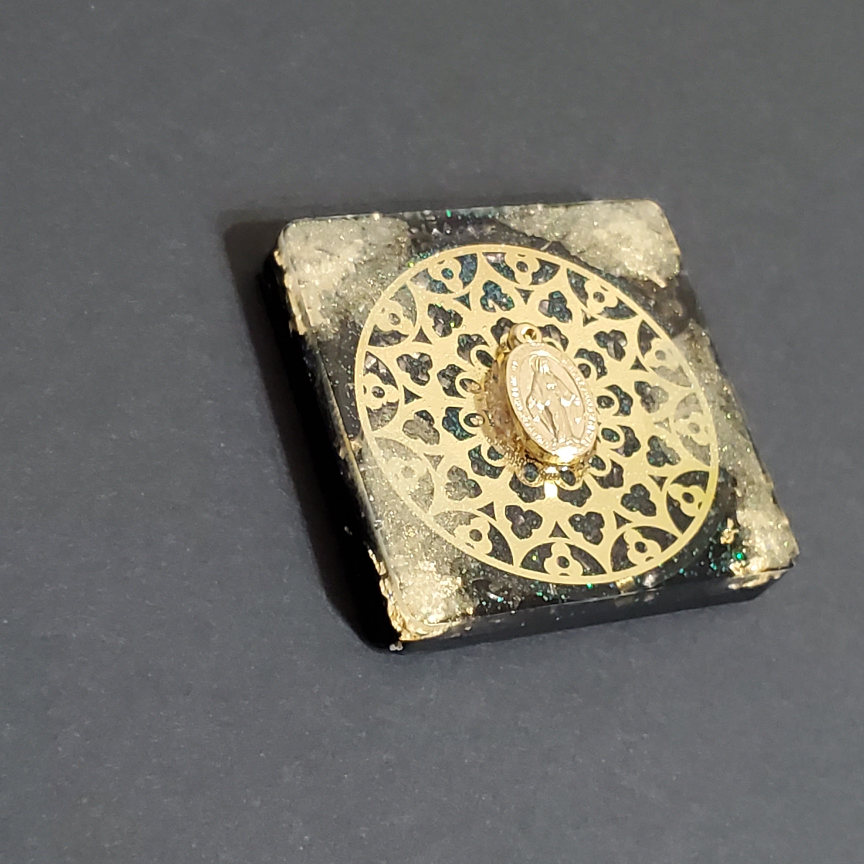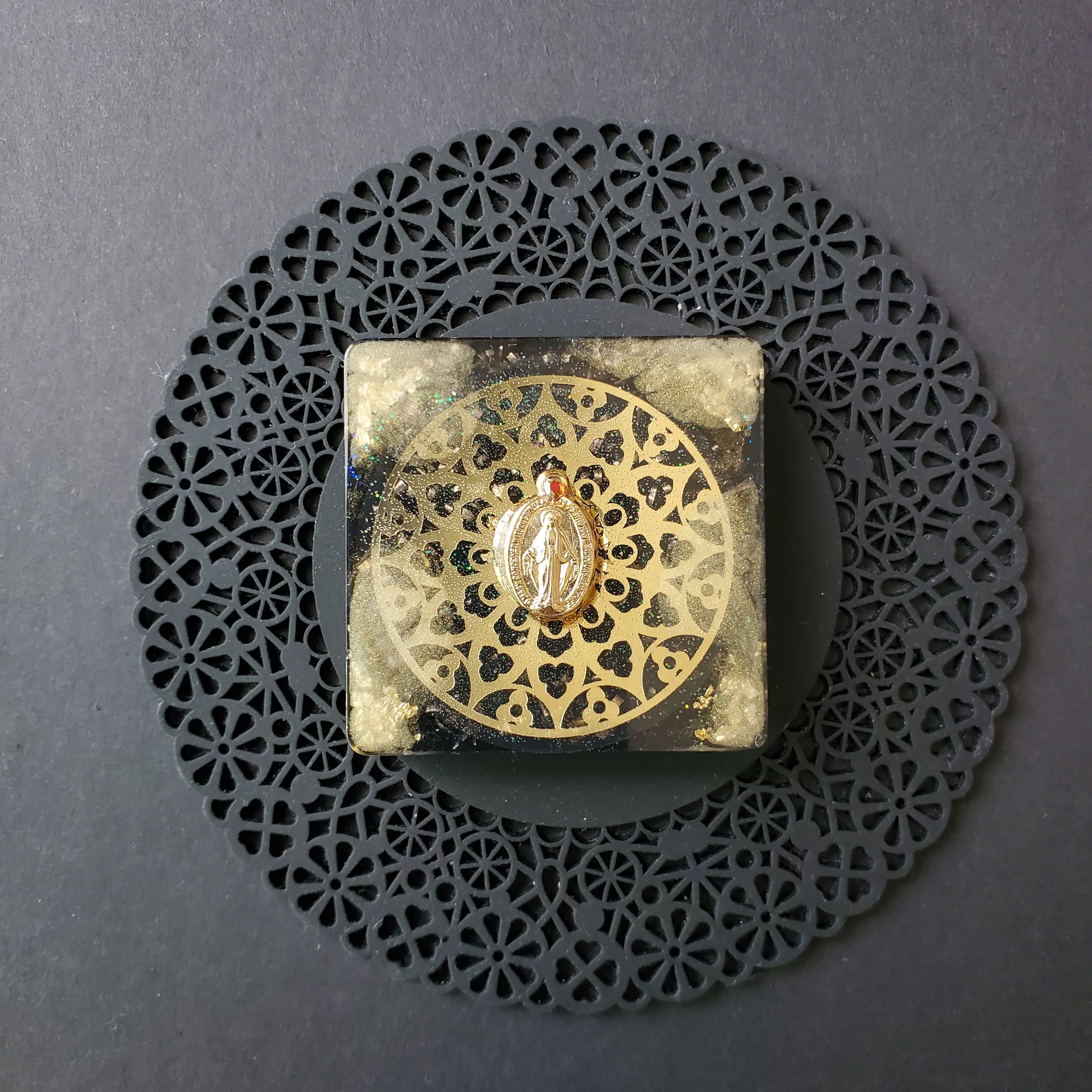 センターにマリア様の不思議メダイを配置することで、オルゴナイトにさらに愛のエネルギーが高まりました。マリア様のエネルギーがお好きな方に送ります。