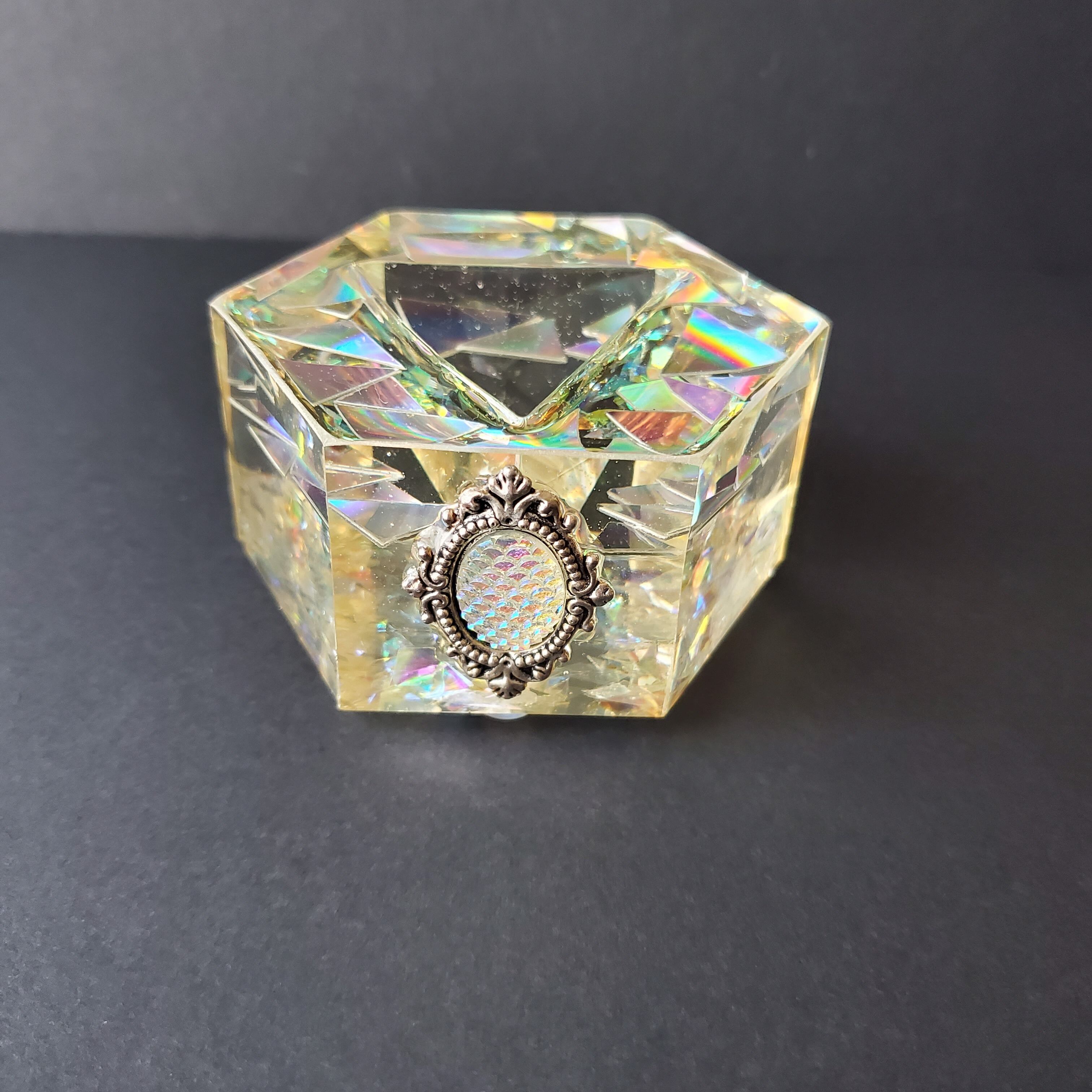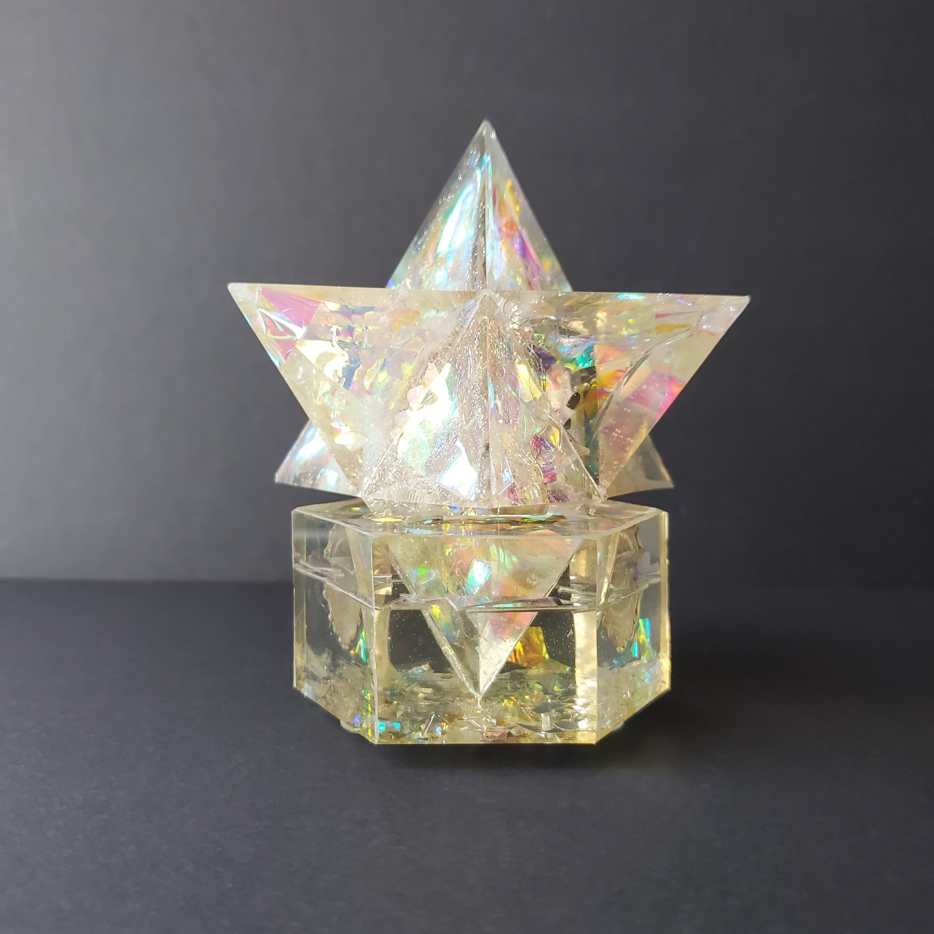オーロラフィルムを全体に封入した、ペールイエローの美しいマカバ型オルゴナイト。光の角度によって、虹のような多次元の輝きが浮かび上がり、見るたびに違う表情を見せてくれます。