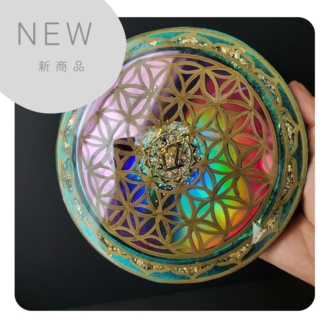 光が当たる角度で虹色にきらめくフラワーオブライフのパワープレート。