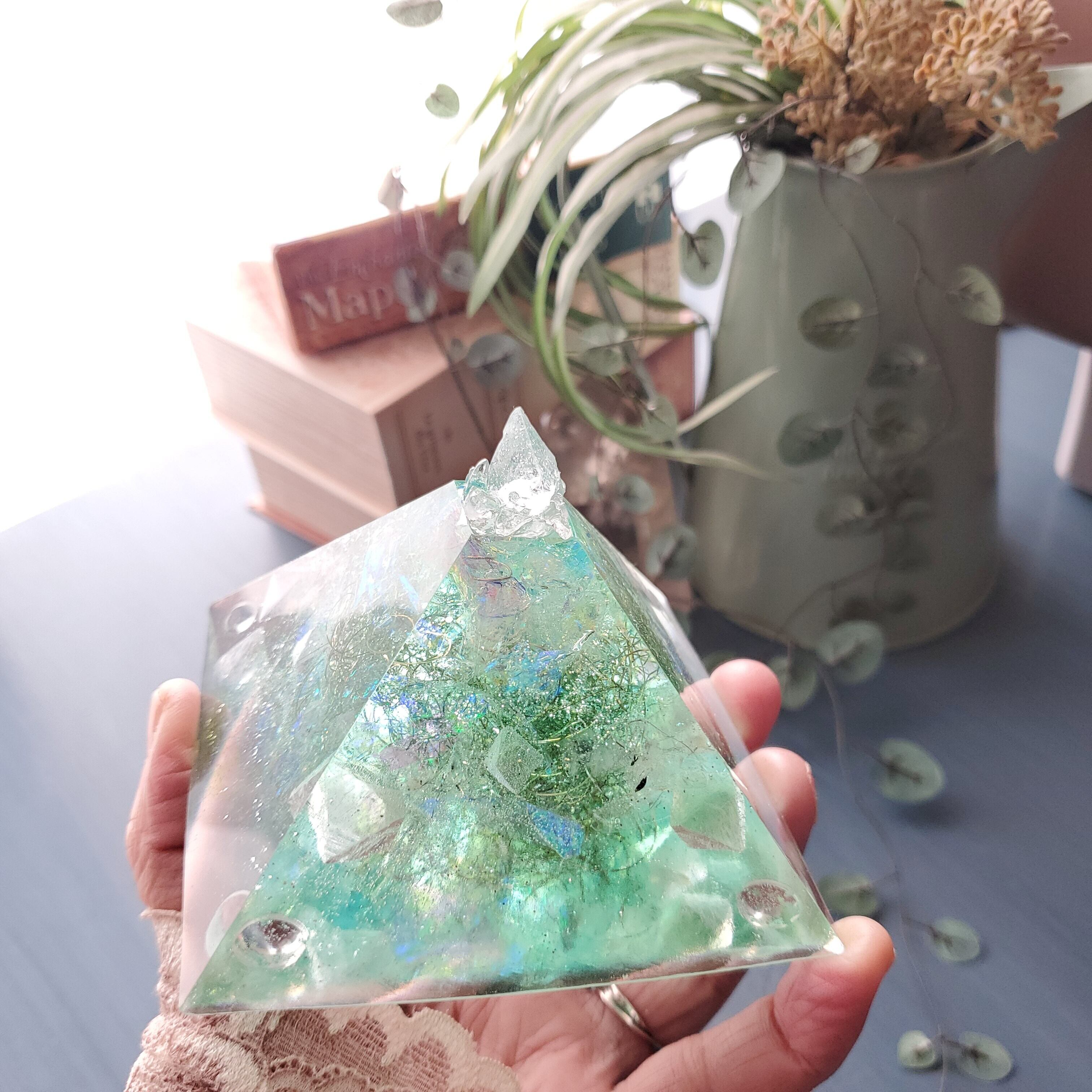 先端のアンダラクリスタルに光を集め、宇宙へと放つように意図したピラミッド型オルゴナイトです。黄金比でデザインされたピラミッドの頂上には、