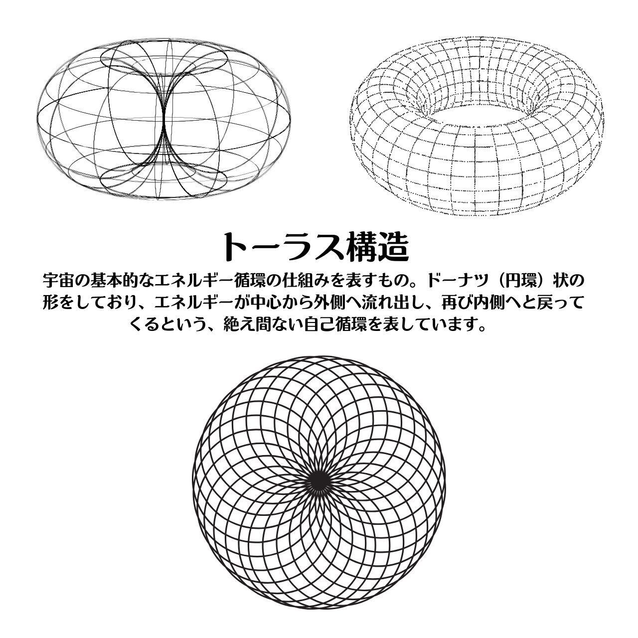 さらに、虹色のエネルギーはトーラス構造(無限循環)として絶え間なく循環しています。トーラス構造は私達や、物質、地球、などあらゆるもののエネルギー構造です。