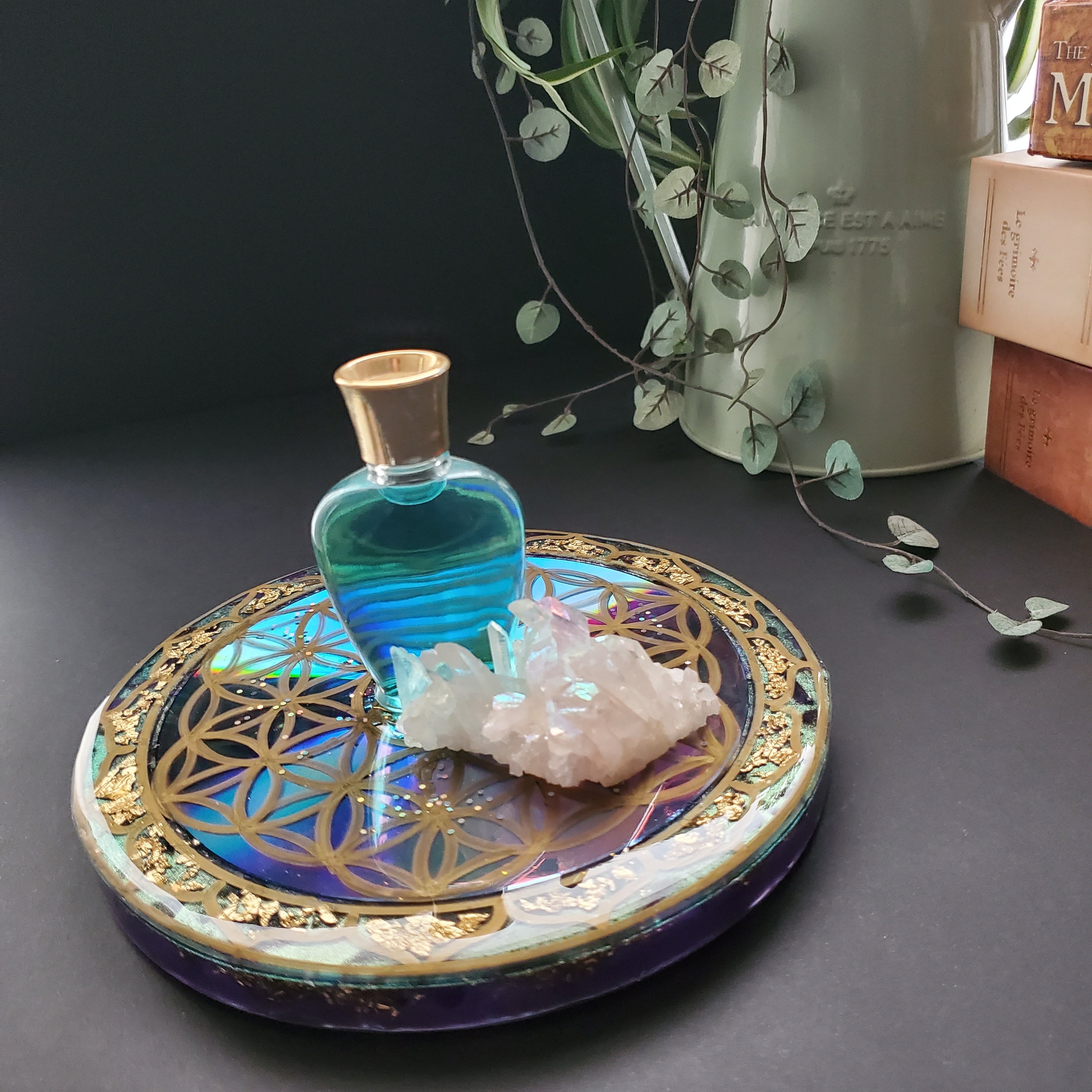 虹色に輝くフラワーオブライフのパワープレート。自然光や照明の角度により無数の虹色パターンを生み出します。その光は、あなたの内側に眠る力強さと輝きを呼び覚まし、未来へと背中を押してくれるサポートに。