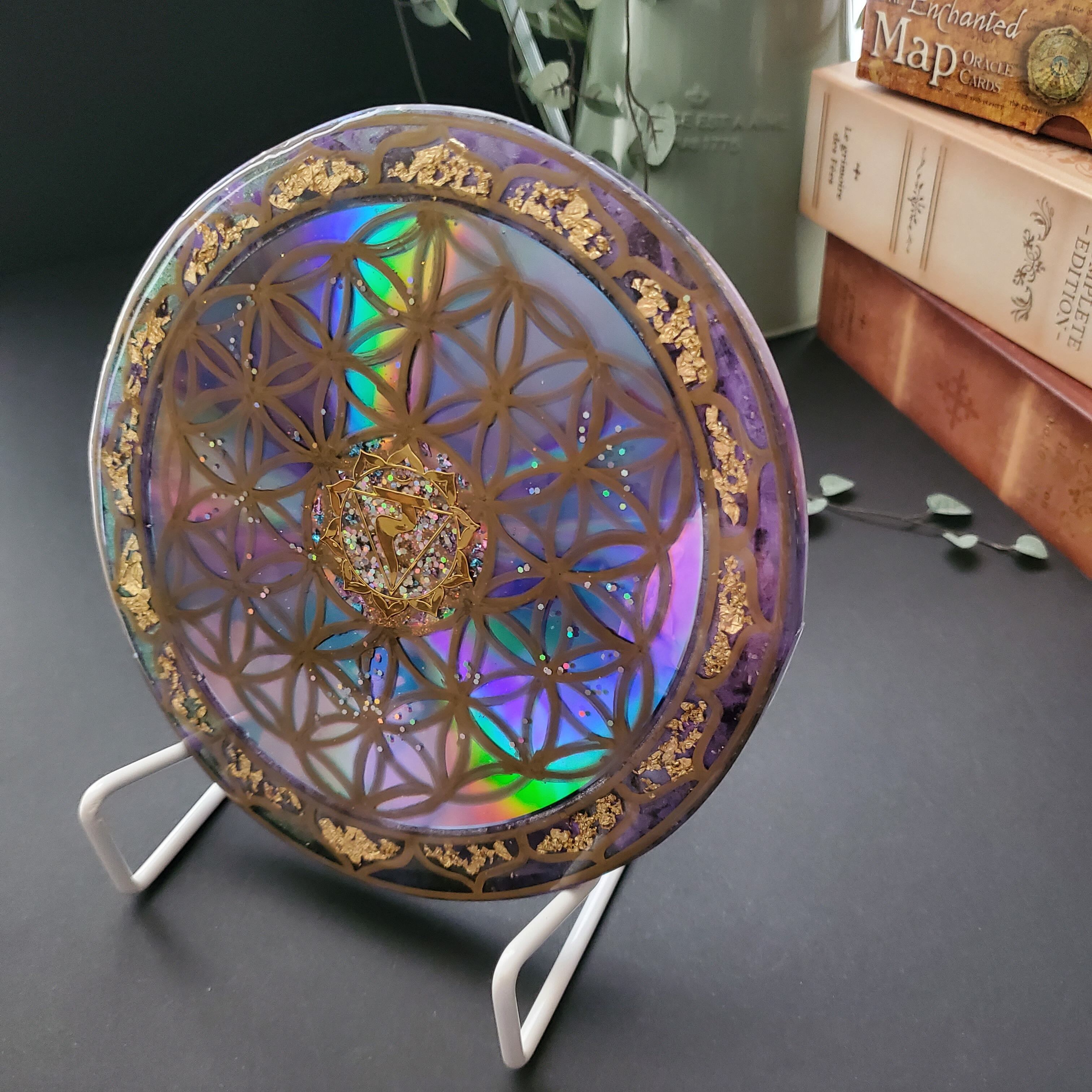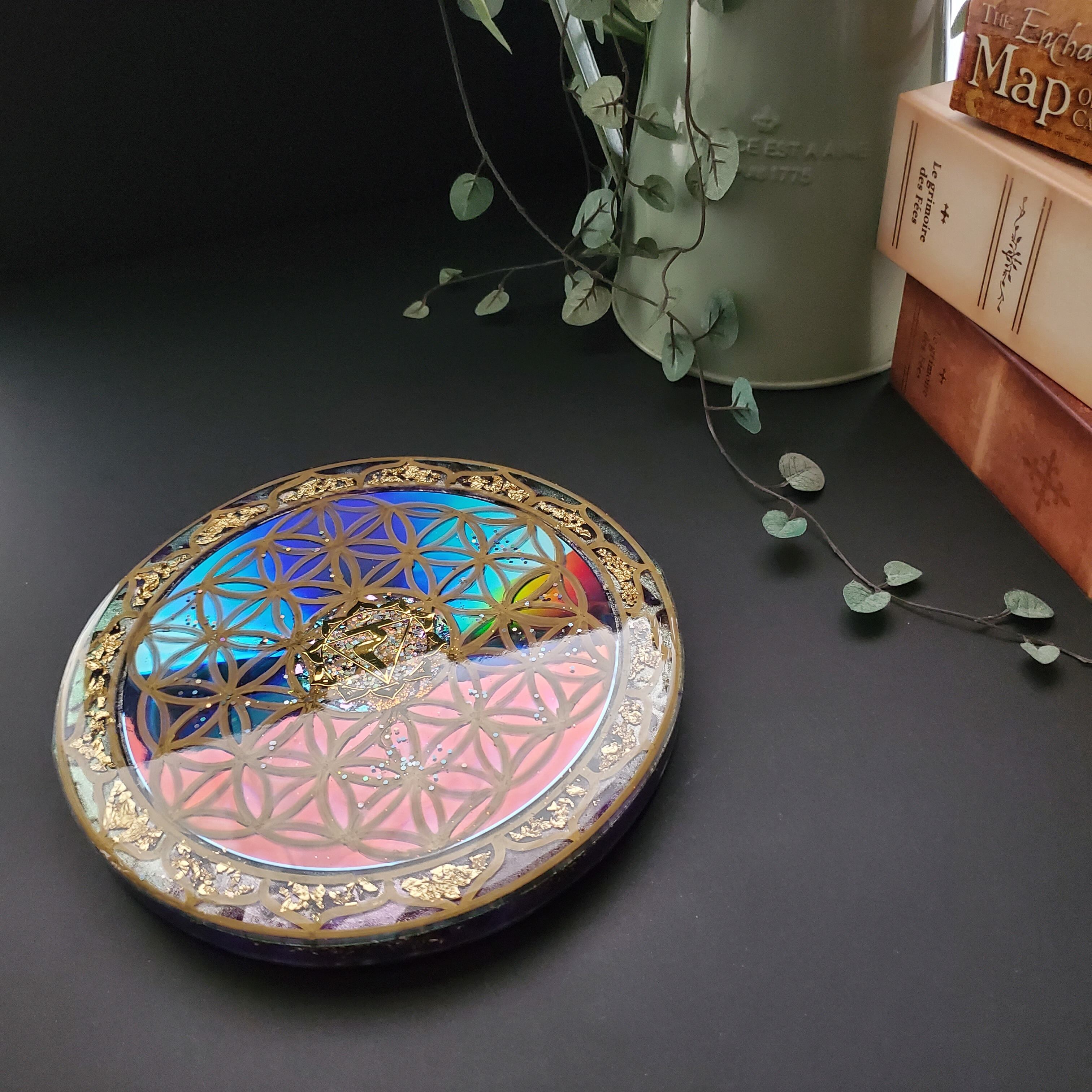 虹色の光とフラワーオブライフとオルゴナイトがベストな形で出会った特別な一枚です。お部屋に置いておくだけで、光の角度によって 万華鏡のような虹色の光のパターンをいくつも生み出し、それを見つけた瞬間…思わず笑顔になる魔法のオルゴナイトプレート。