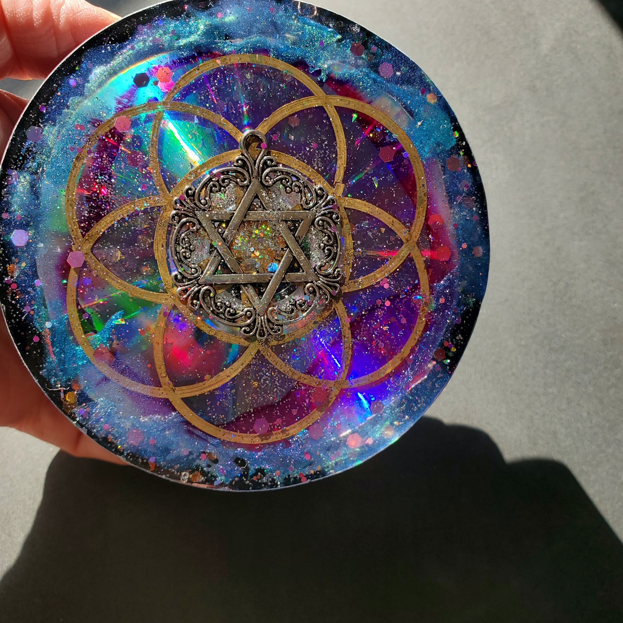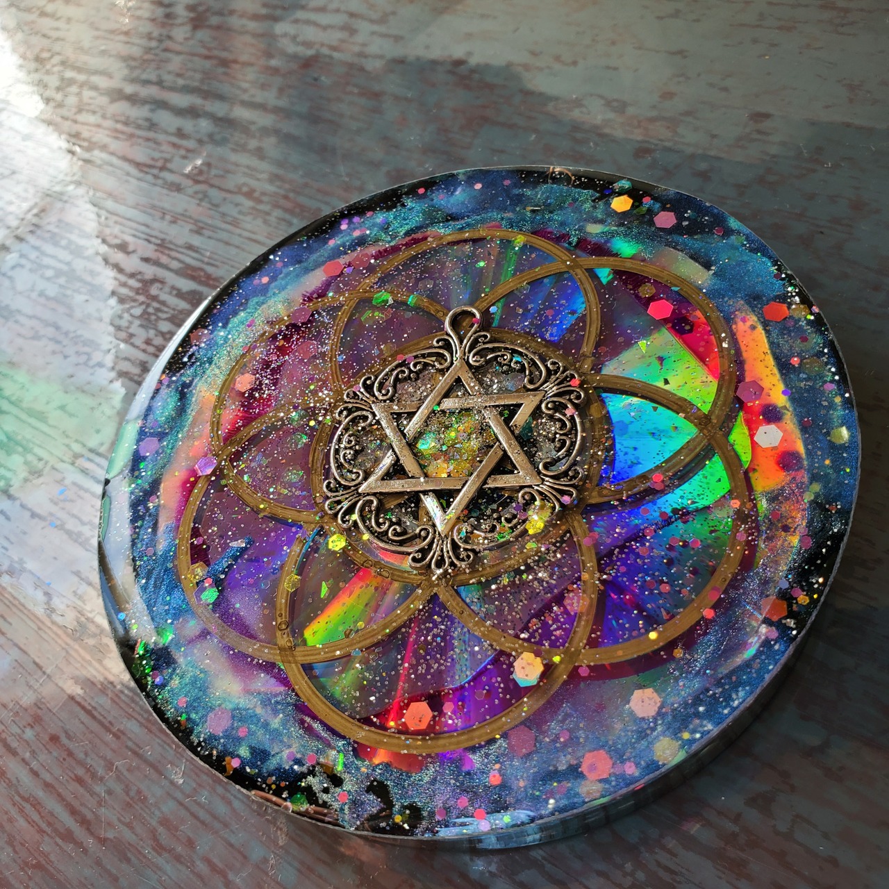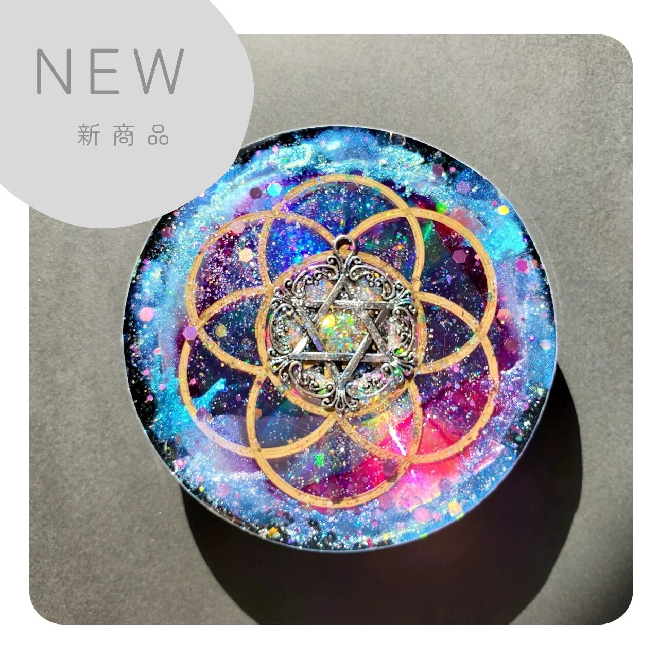 六芒星をテーマにした魔法使いのオルゴナイトプレート。古くから魔法や錬金術で用いられてきた六芒星を用いて制作しています。