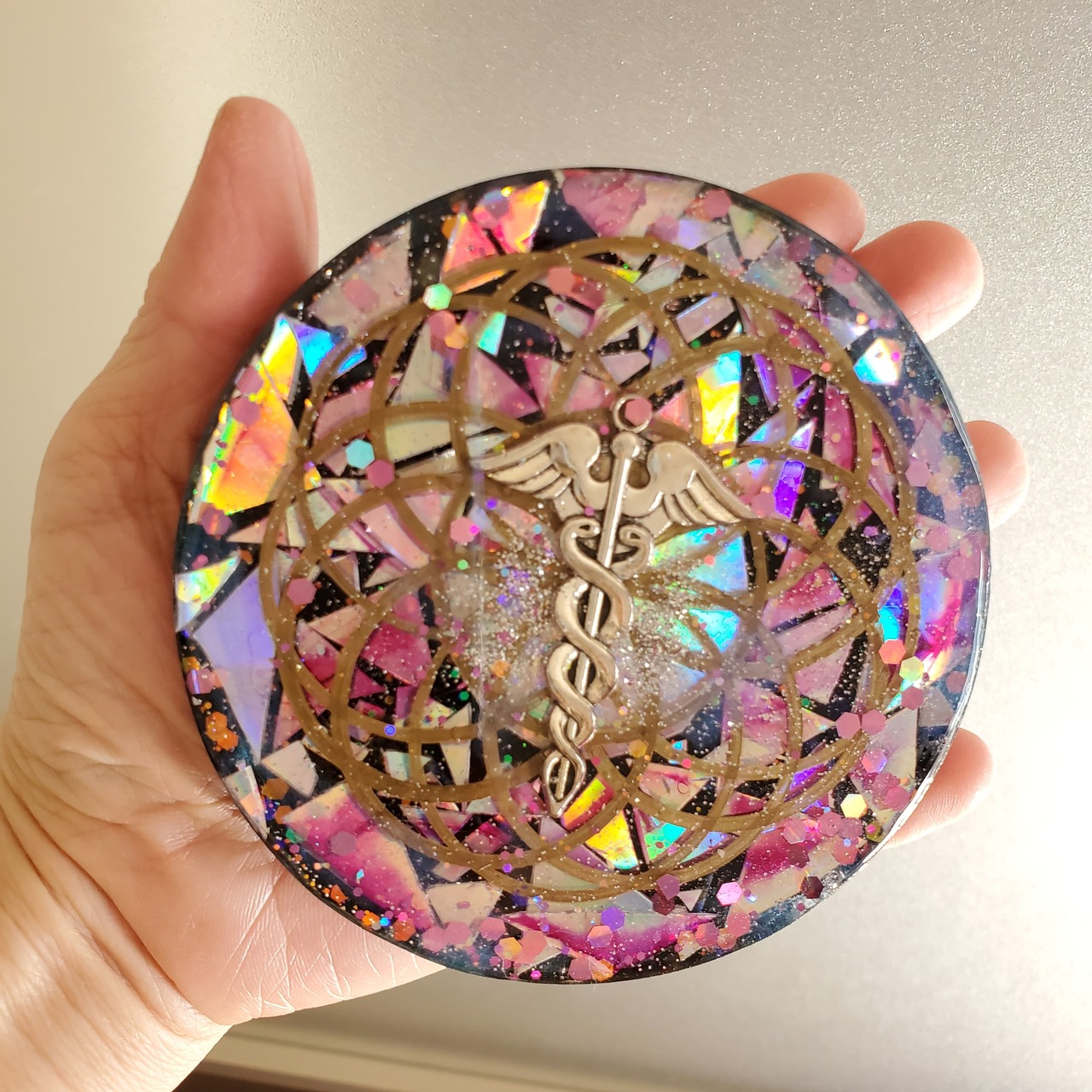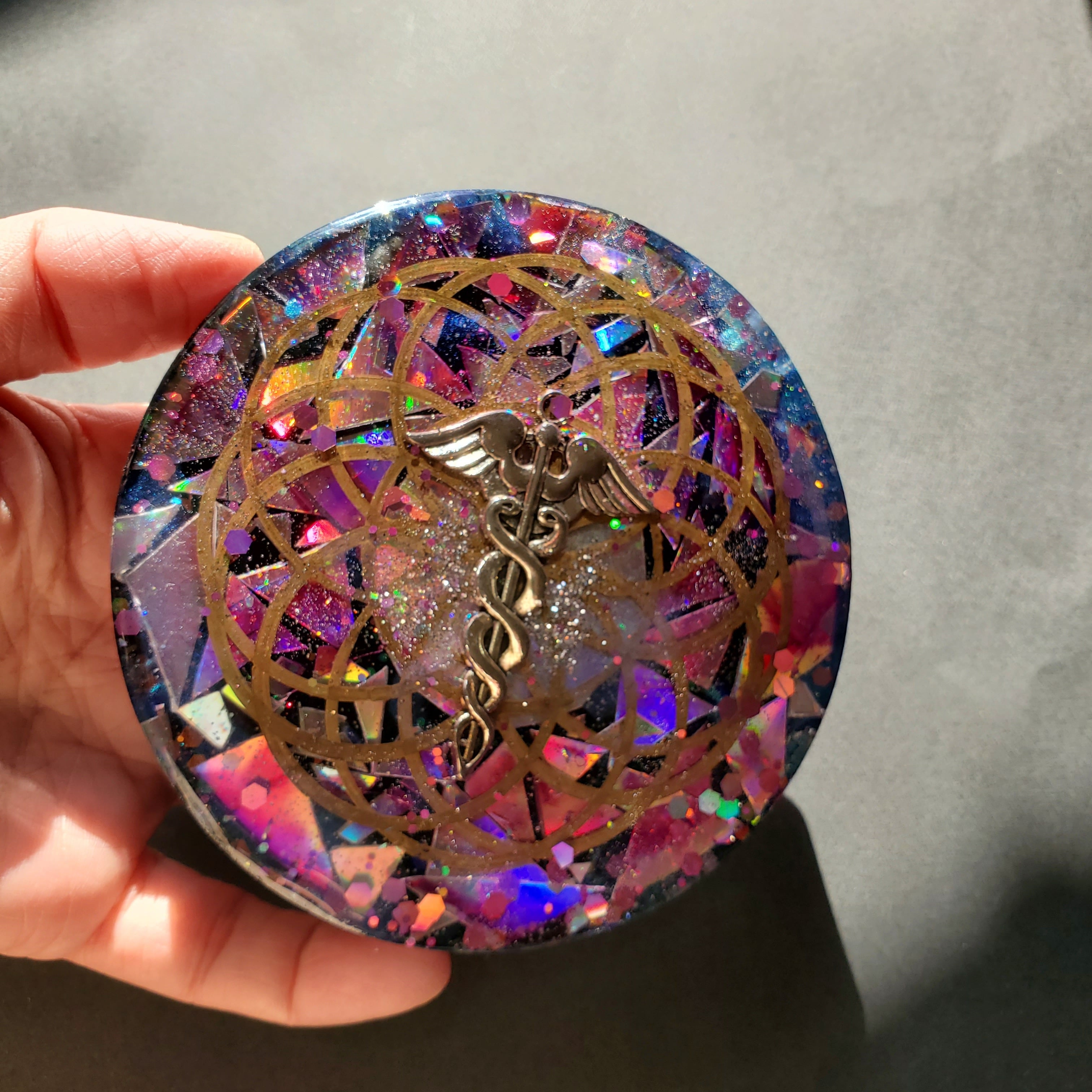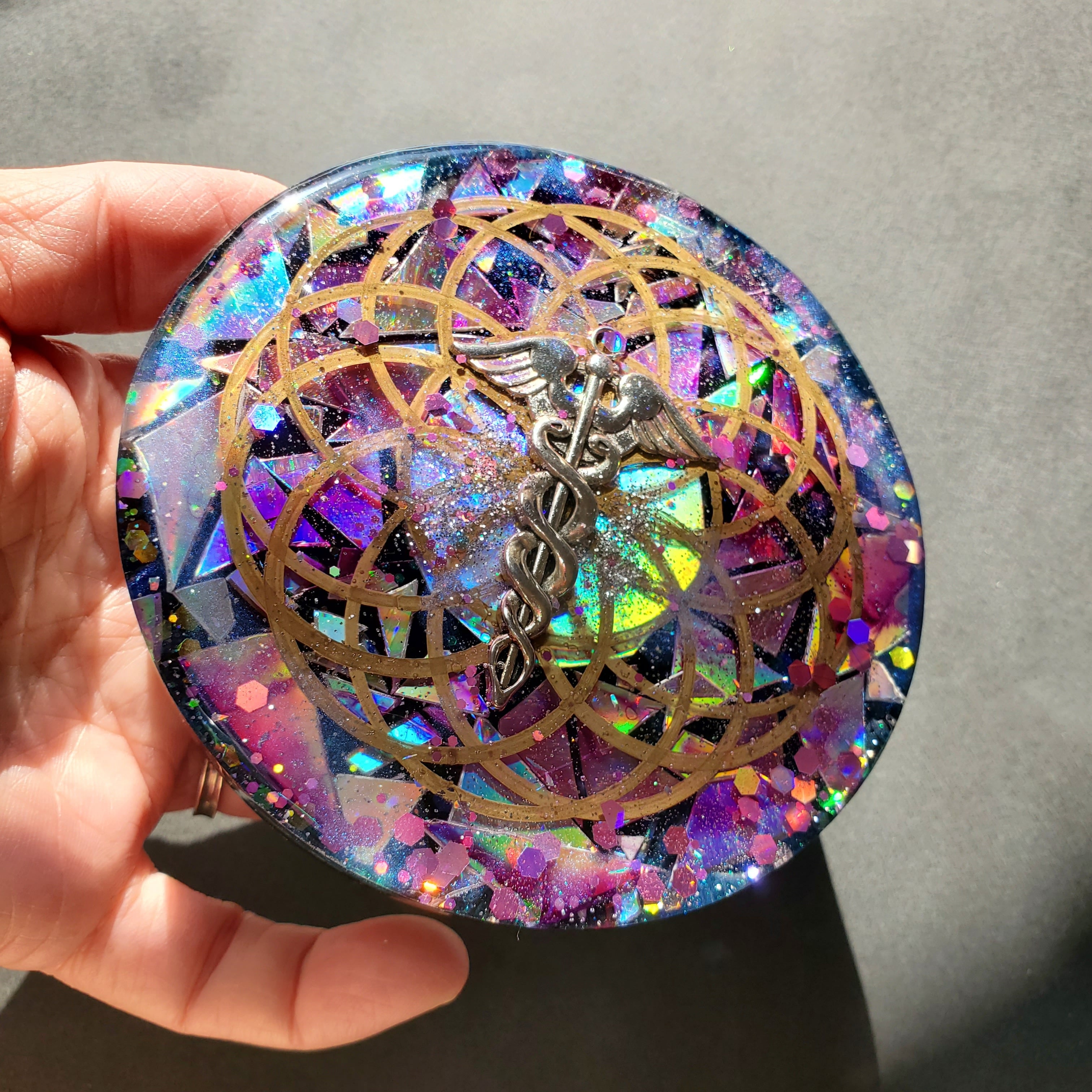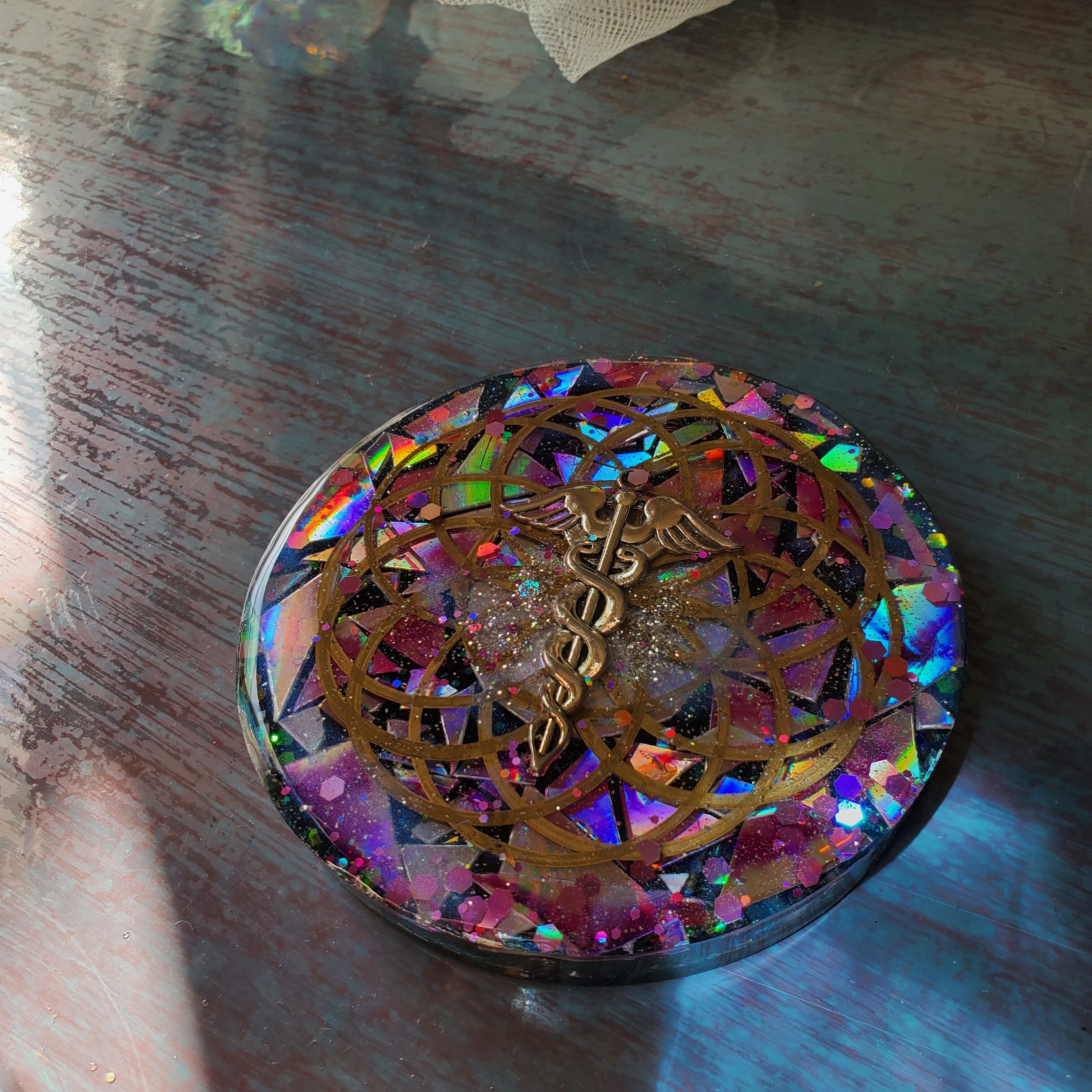 とにかく、ステンドグラスの光を再現したかったので、試行錯誤して完成しました。いろいろな角度から美しいマジカルな光を生み出してくれるその様はまるで魔法のようです。今の変容の時代にぴったりなカドケウスのオルゴナイトです。