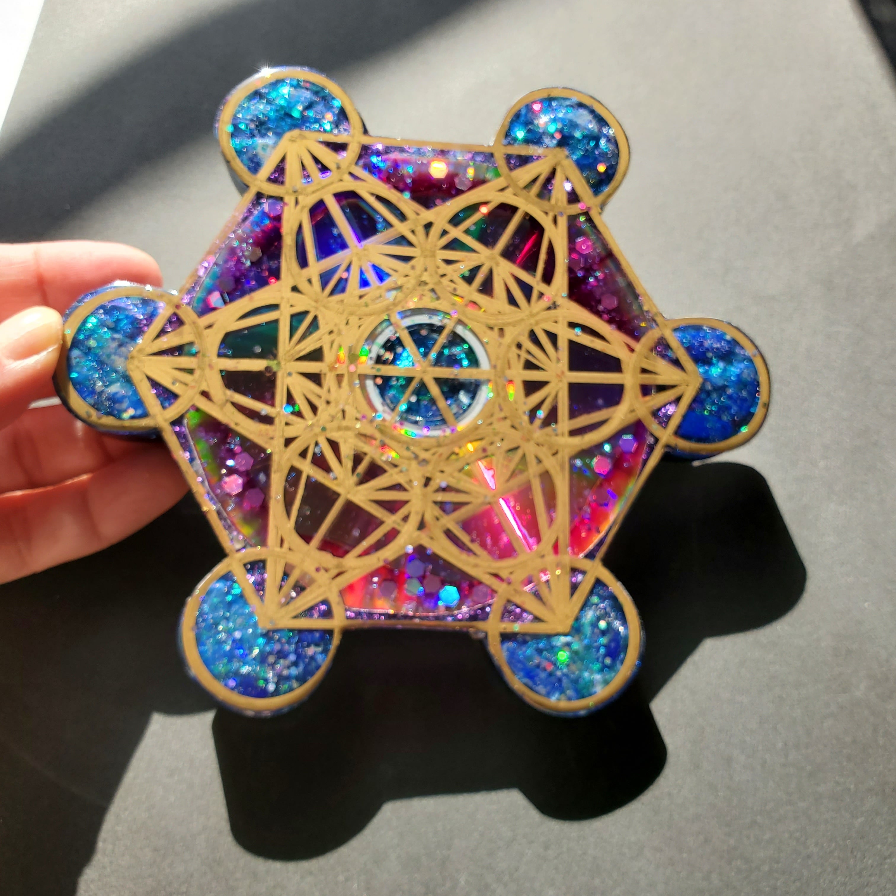 小さなサイズのメタトロン・ディスクを見たくて制作しました。ぜひ持ち運びいろいろは場所でエネルギーを感じてみて見てください。この作品は、宇宙意識とつながるメタトロンの光が、あなたの中のディスクをそっと起動し、内側に眠っていた叡智のディスクが回転を始めるそんなイメージで制作しました。必要な方に届きますように。