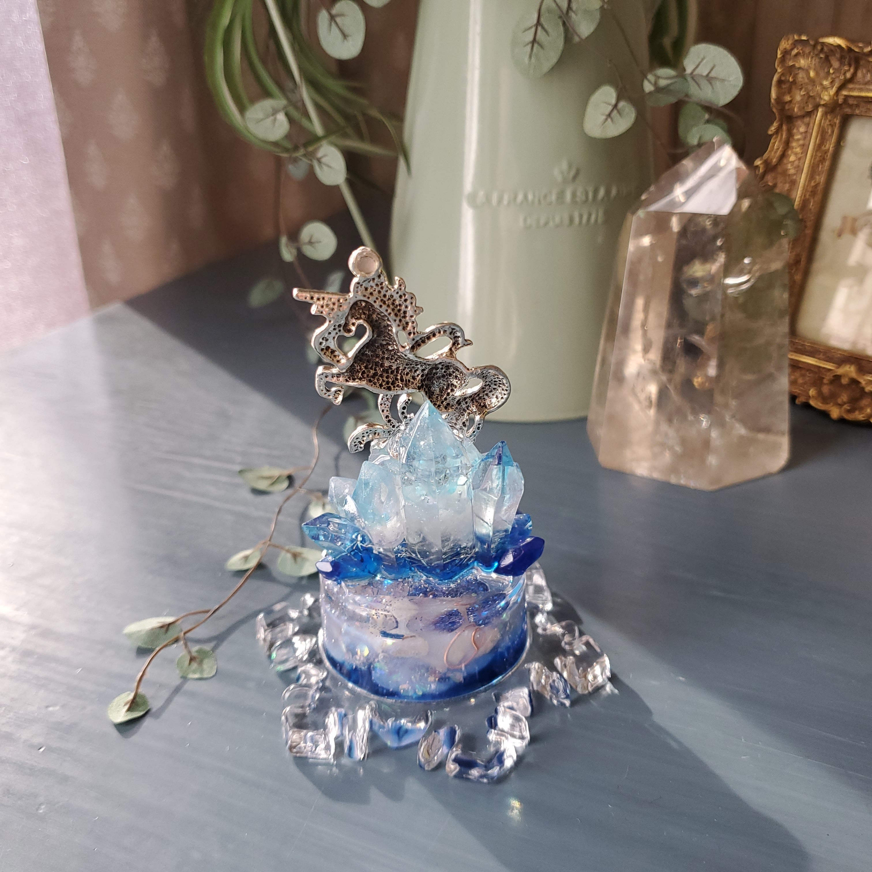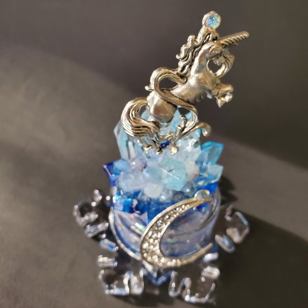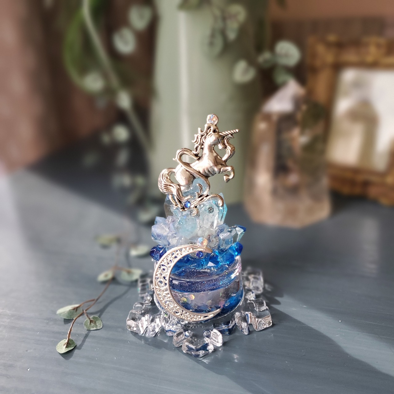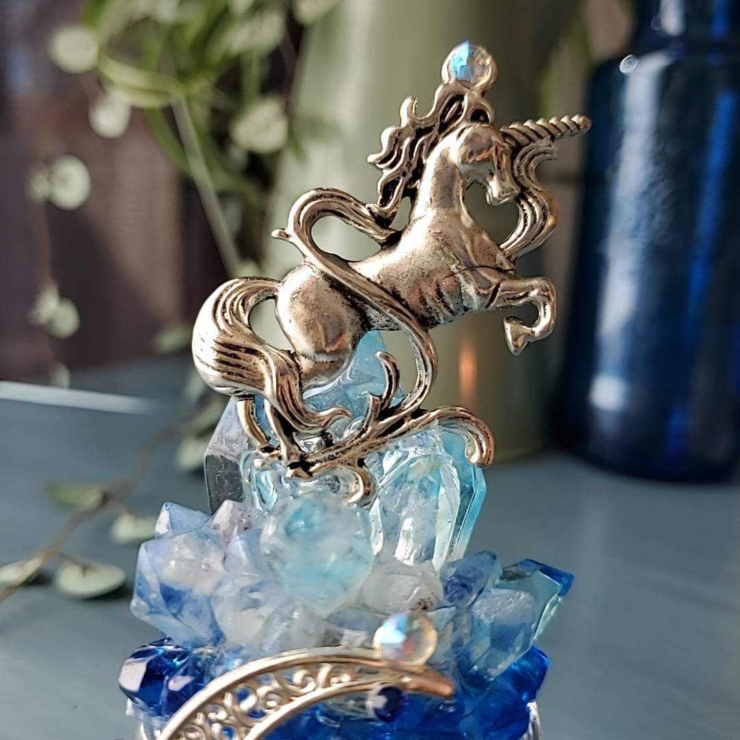 クリスタルクラスターのオルゴナイトの上に、ユニコーンを、