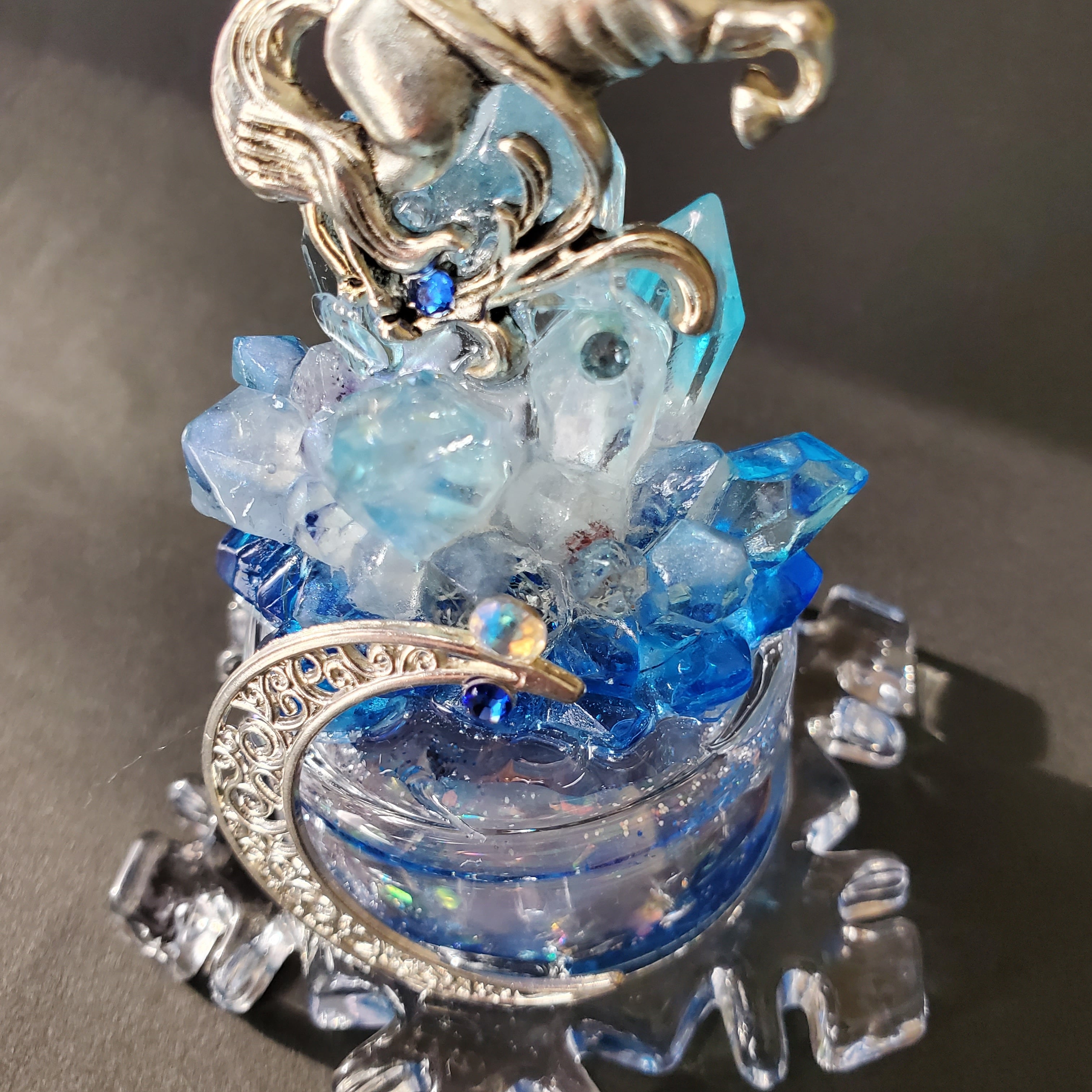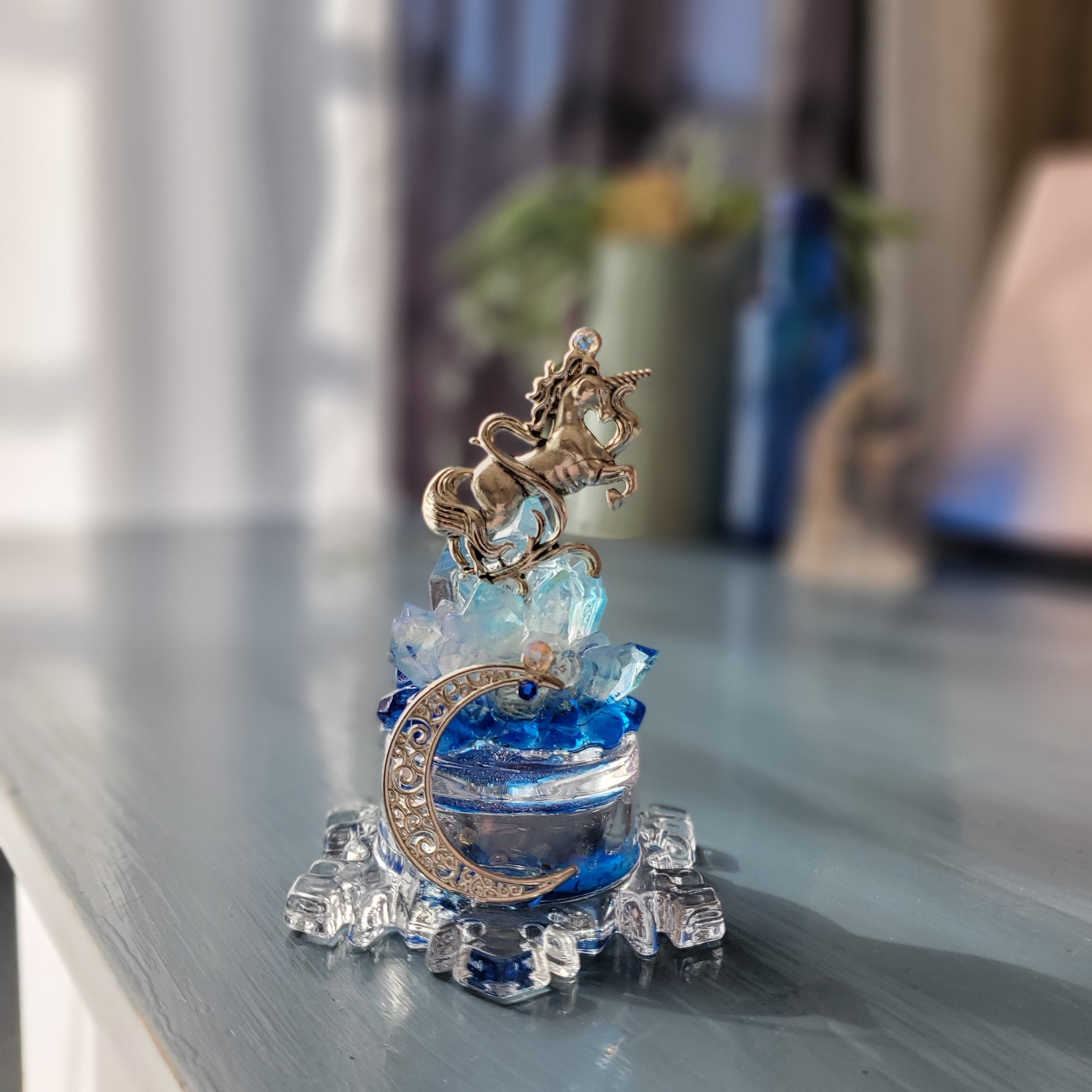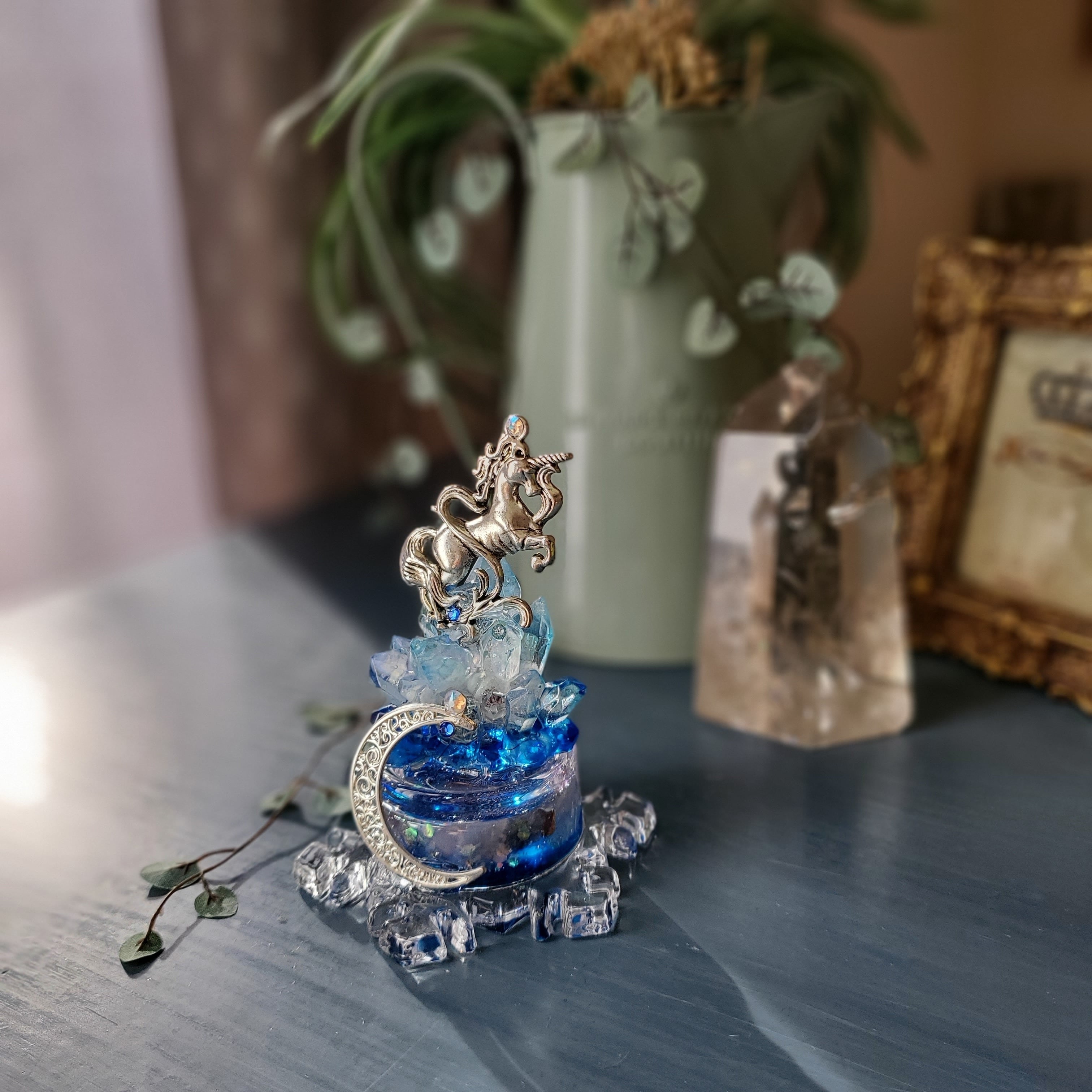 クリスタルクラスターのオルゴナイトの上に、ユニコーンを、