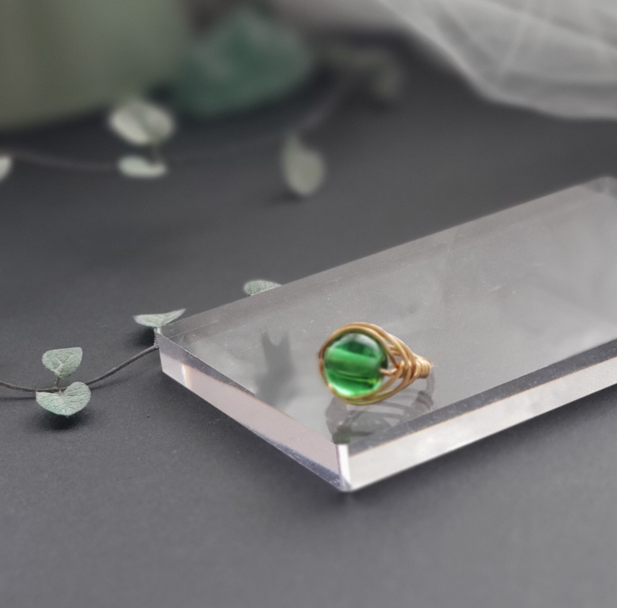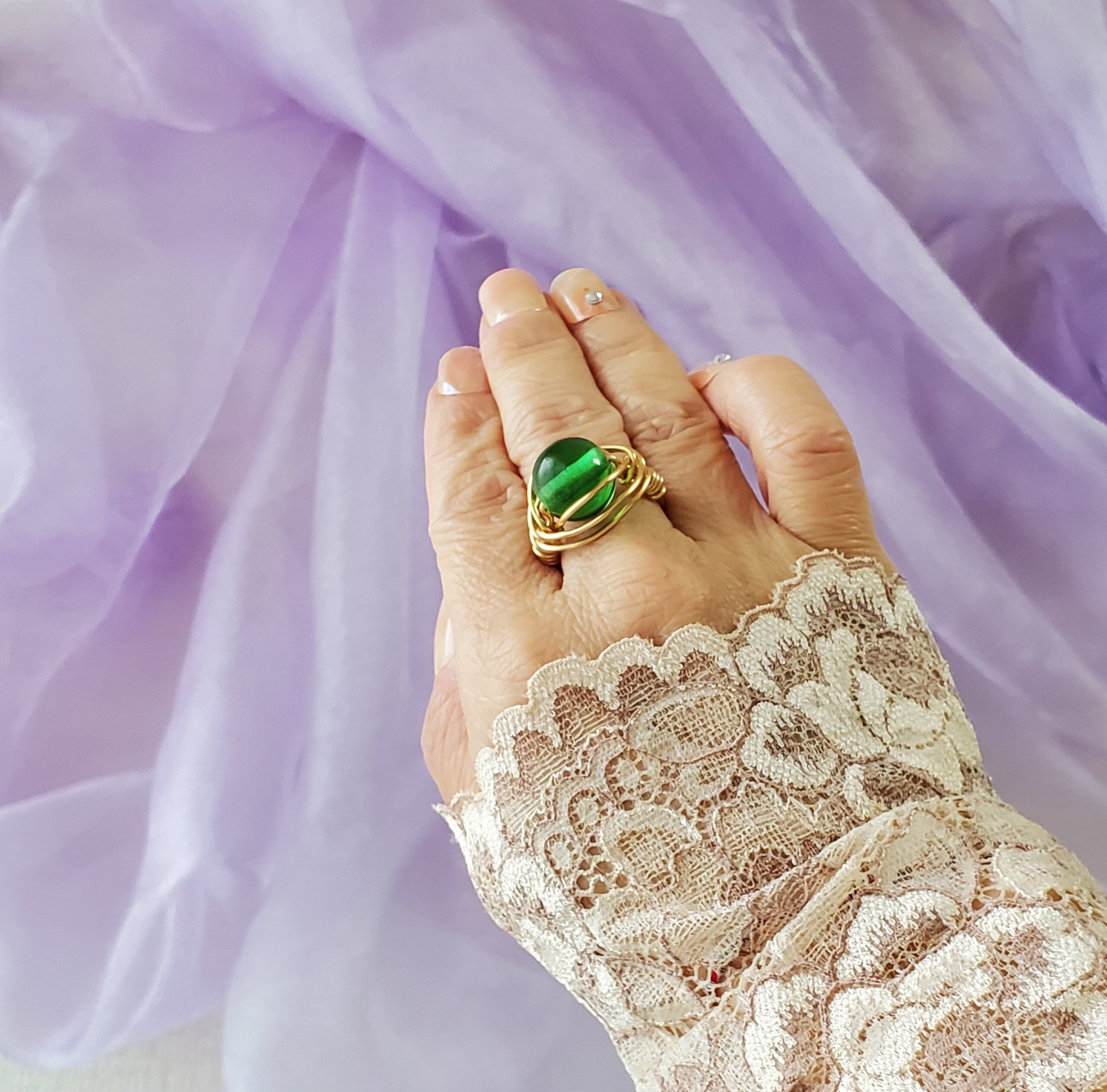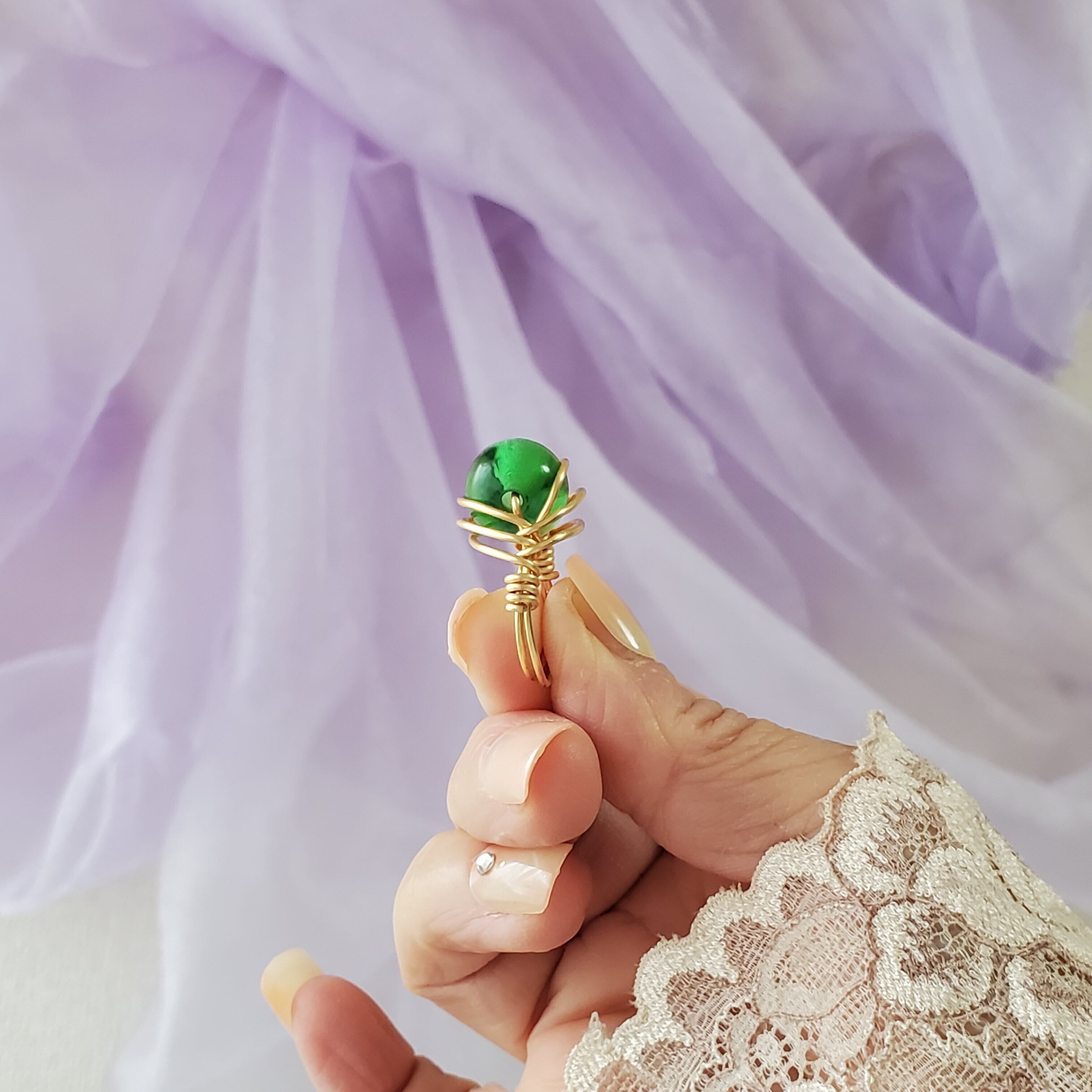 濃い若草色に輝くエメラルドシフトのアンダラクリスタル。その美しい愛と光の波動を、ワイヤーアートで丁寧にリングへと仕上げました。