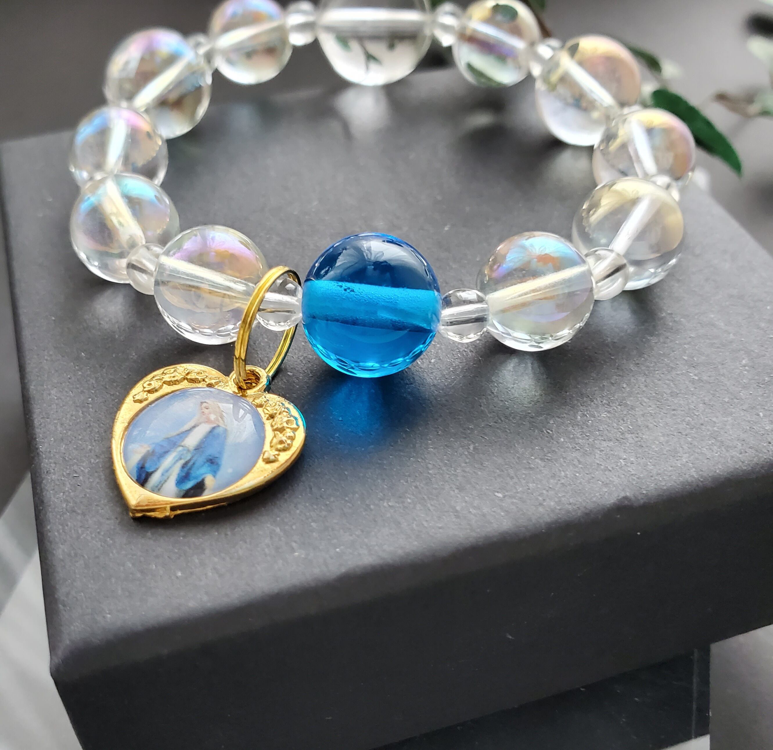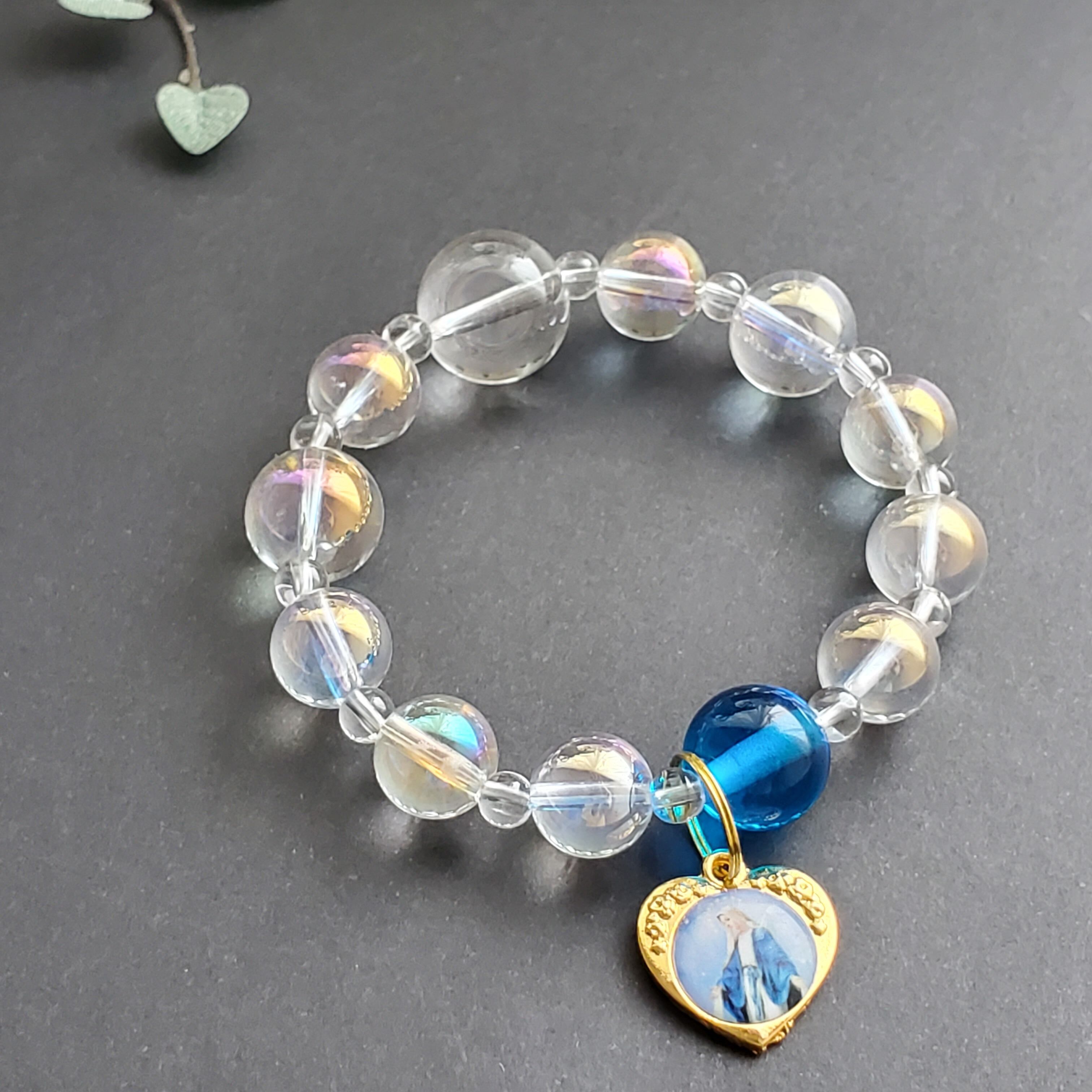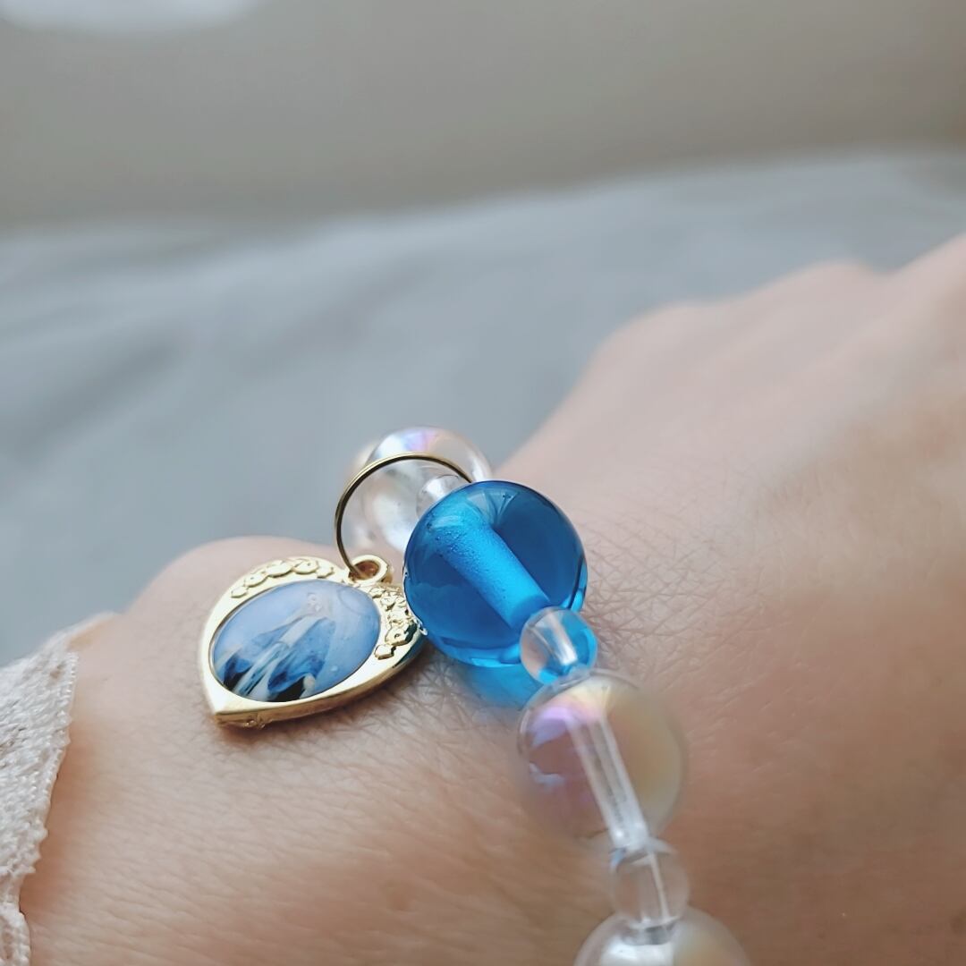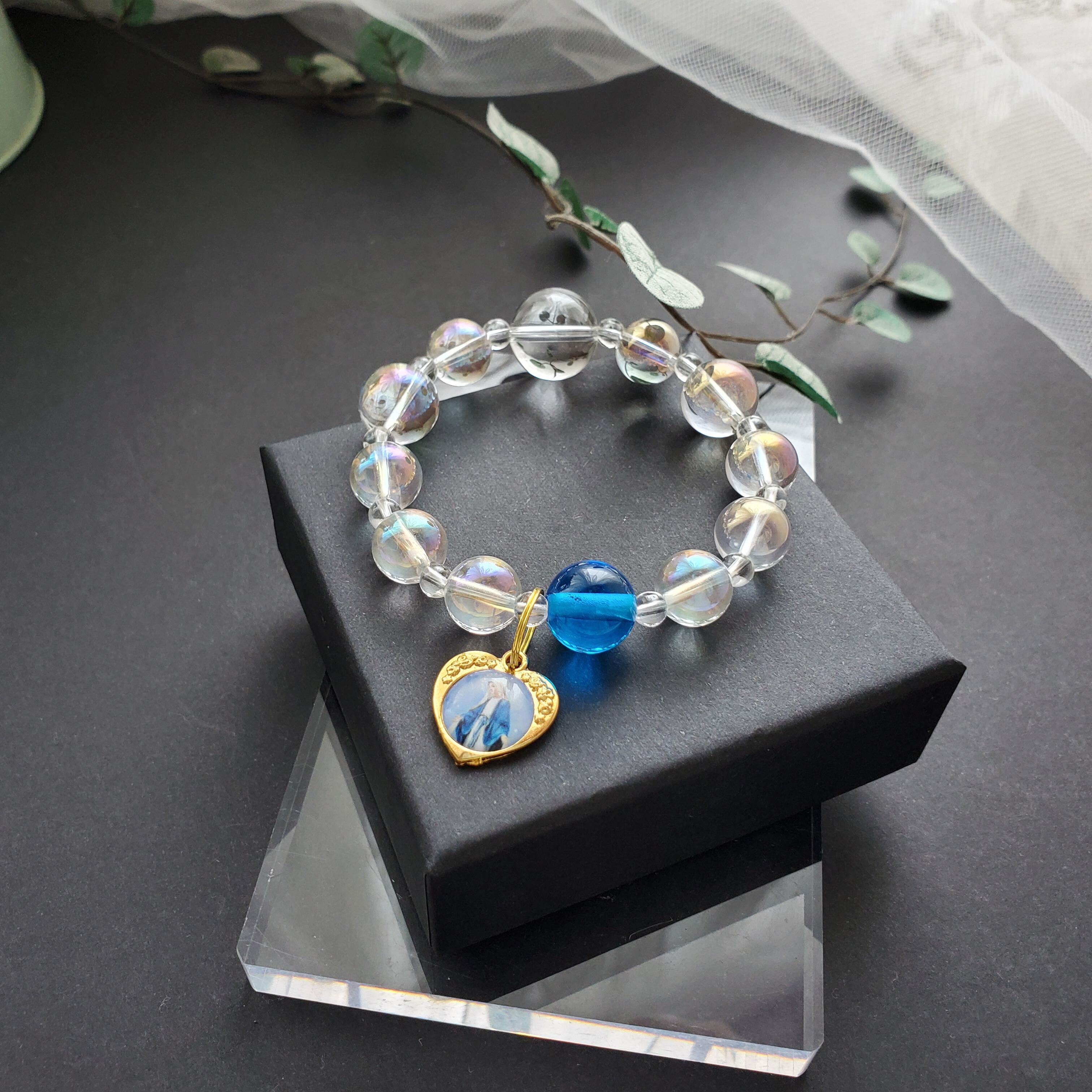 珍しいハート型のマリア様メダイが、愛の守護をそっと添えて。エンジェルオーラクリスタルが虹色の光をブレスに纏わせ、天使のような輝きを生み出します。