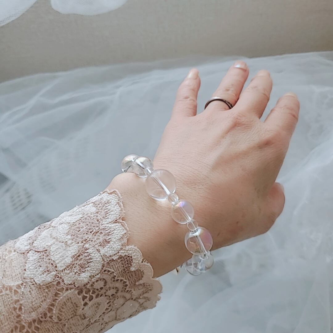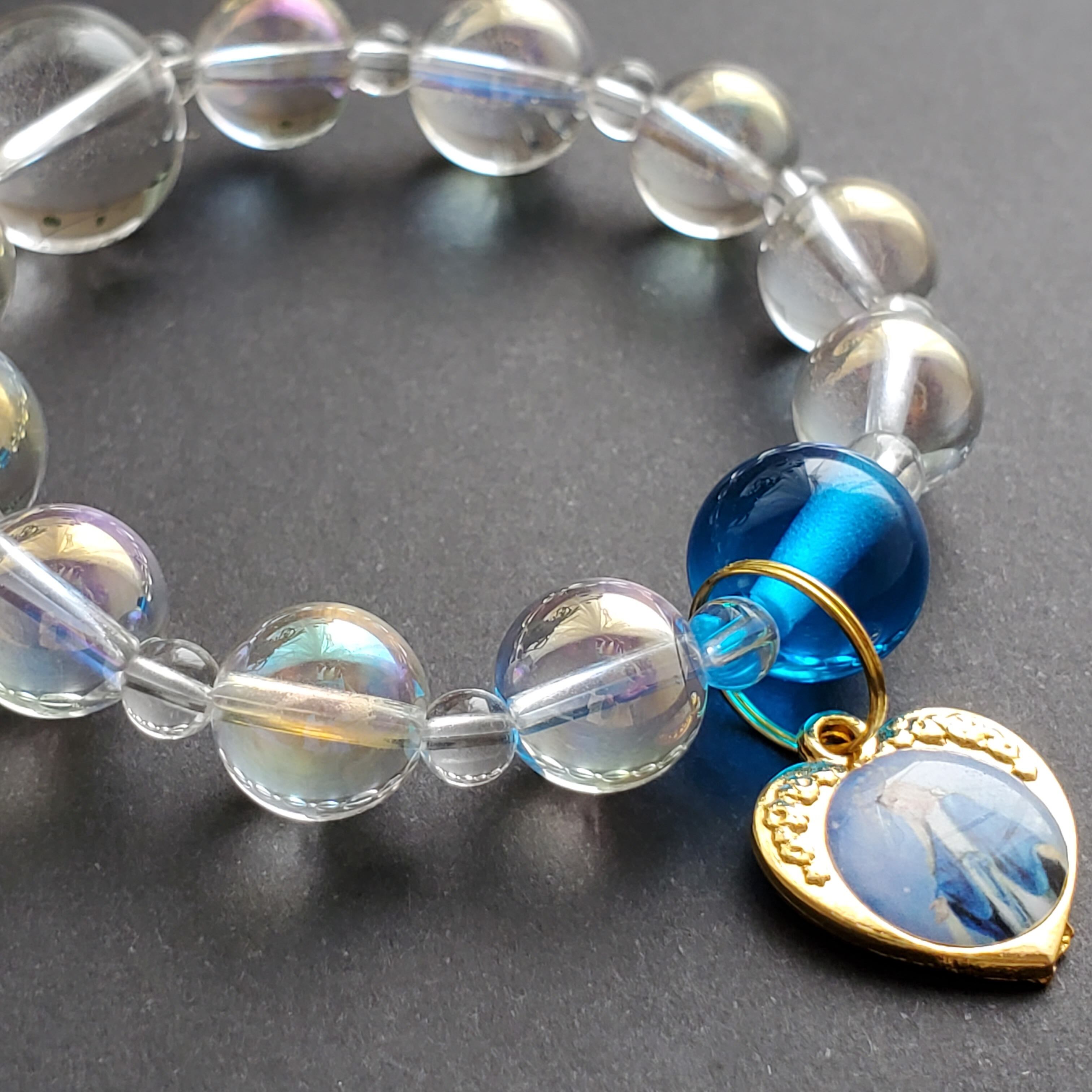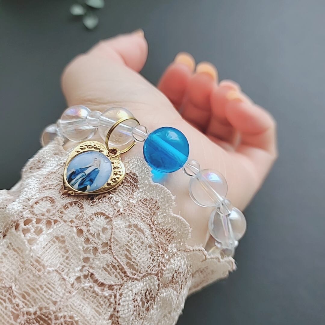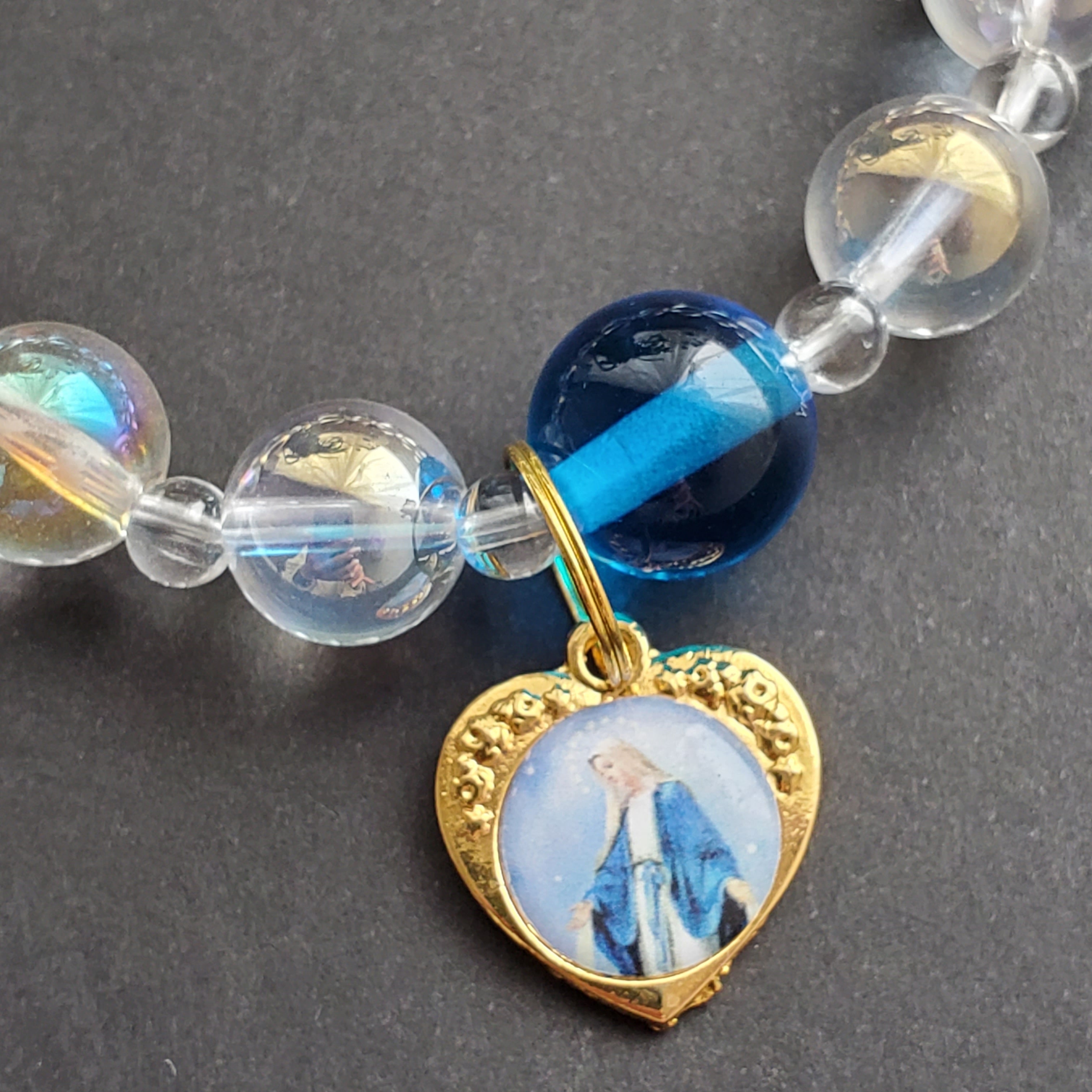 珍しいハート型のマリア様メダイが、愛の守護をそっと添えて。エンジェルオーラクリスタルが虹色の光をブレスに纏わせ、天使のような輝きを生み出します。