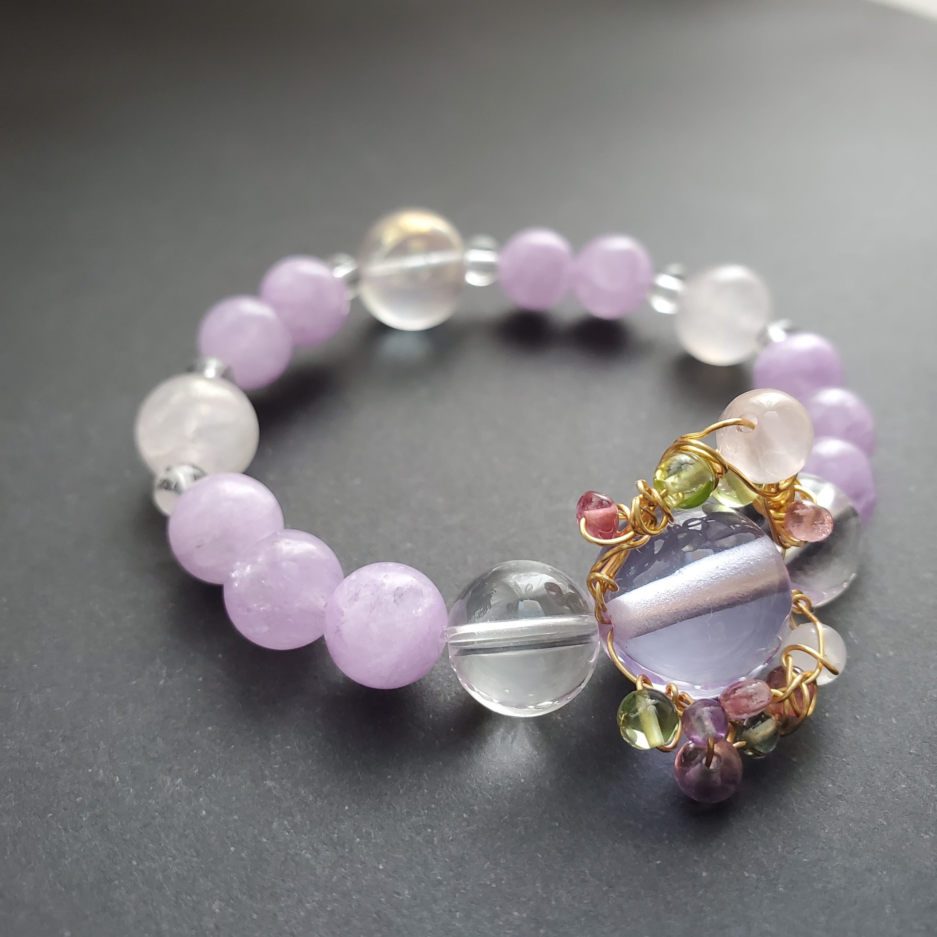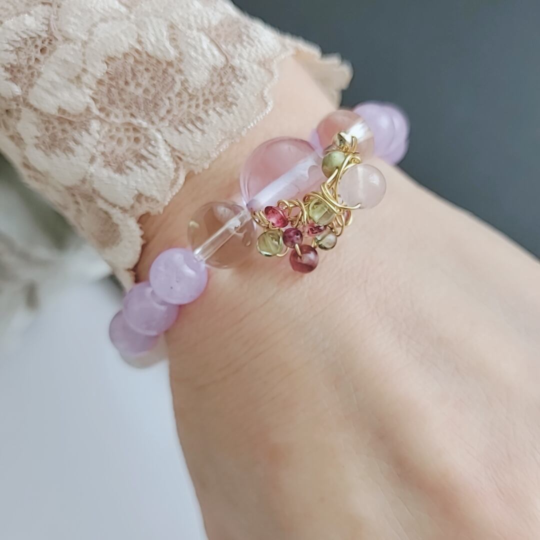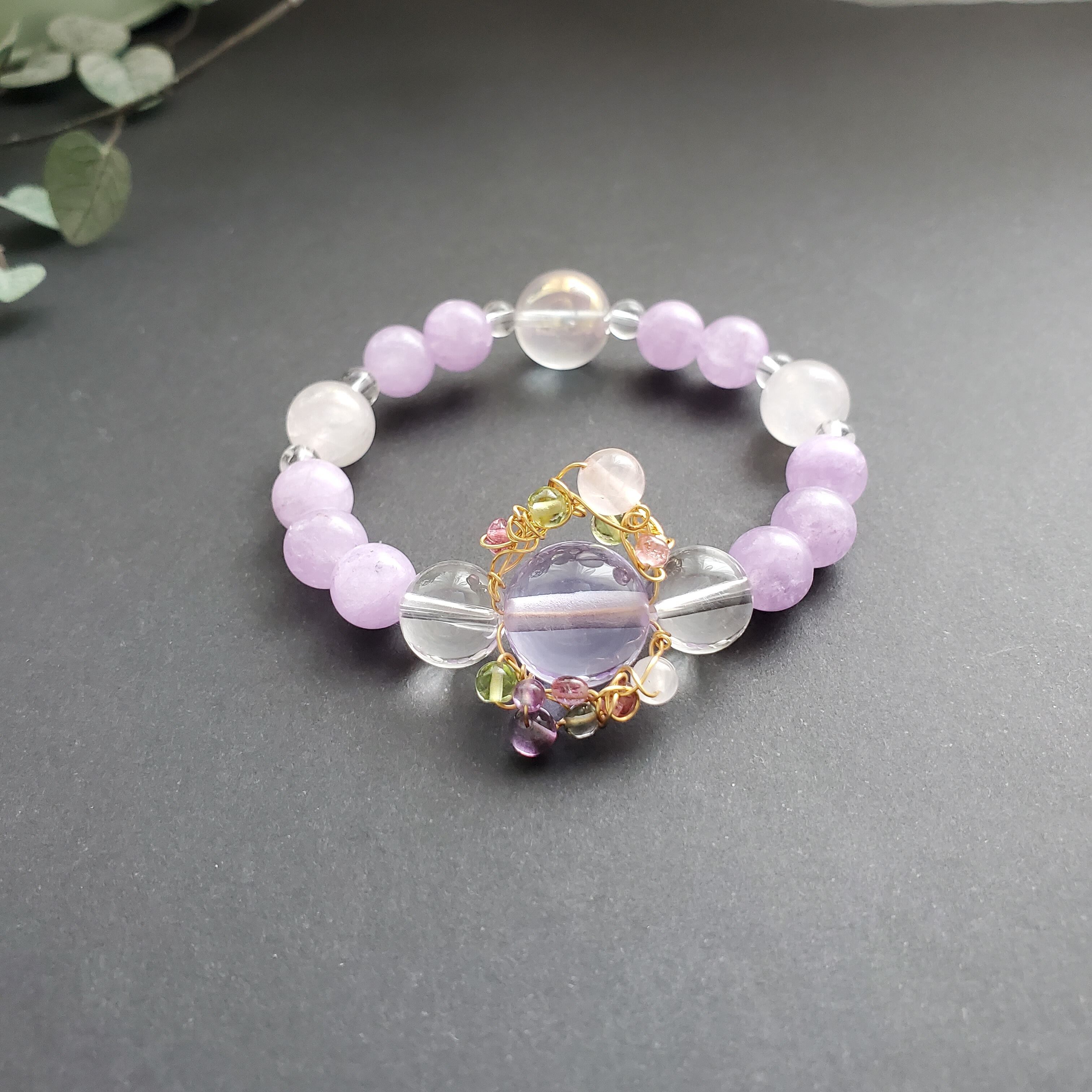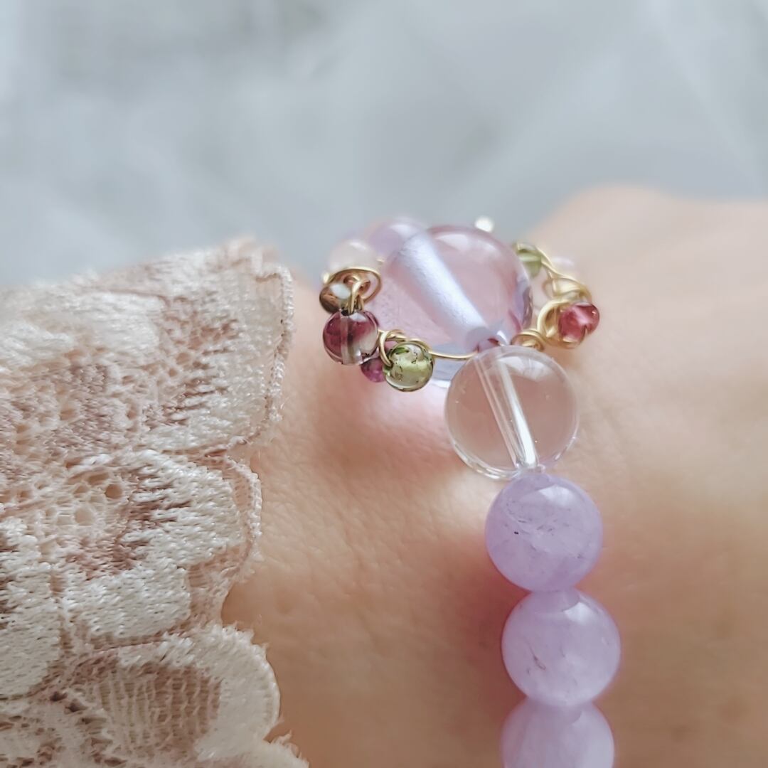 ラベンダー色のアンダラクリスタルにワイヤーアートで丁寧にデコレーションした一粒は、まるで小さな花束のよう。その繊細な美しさが、あなたの女神性をそっと呼び覚まします。