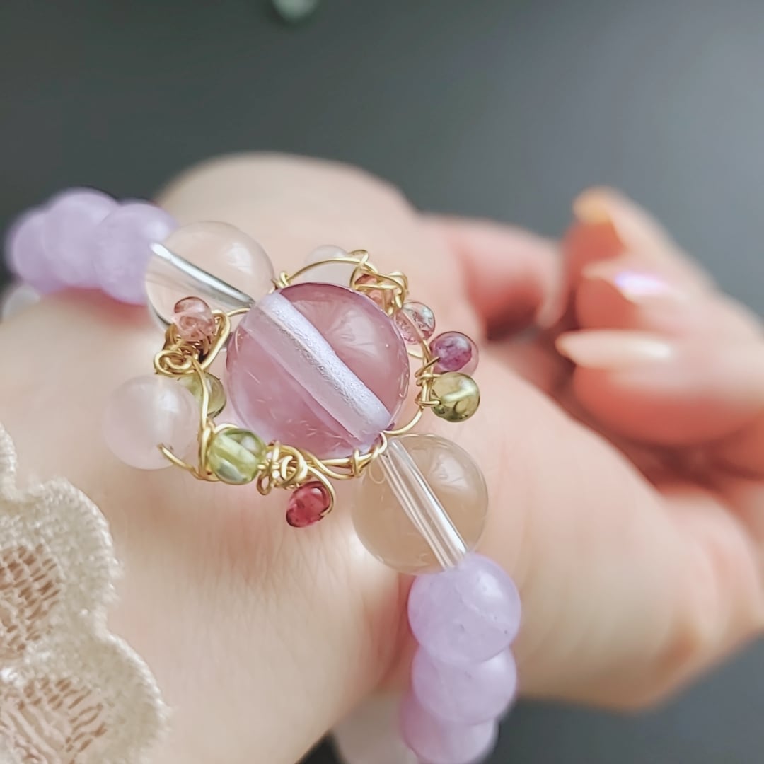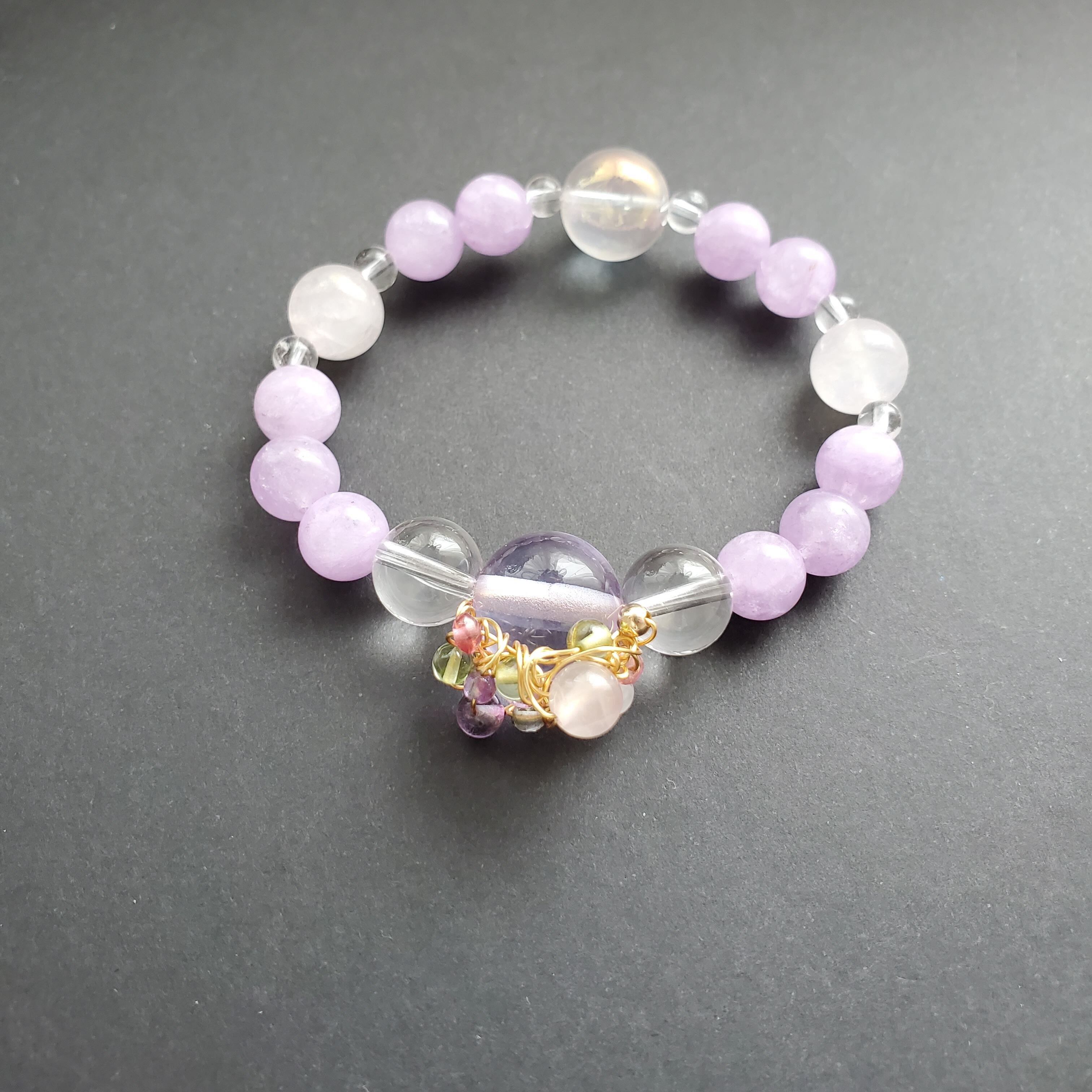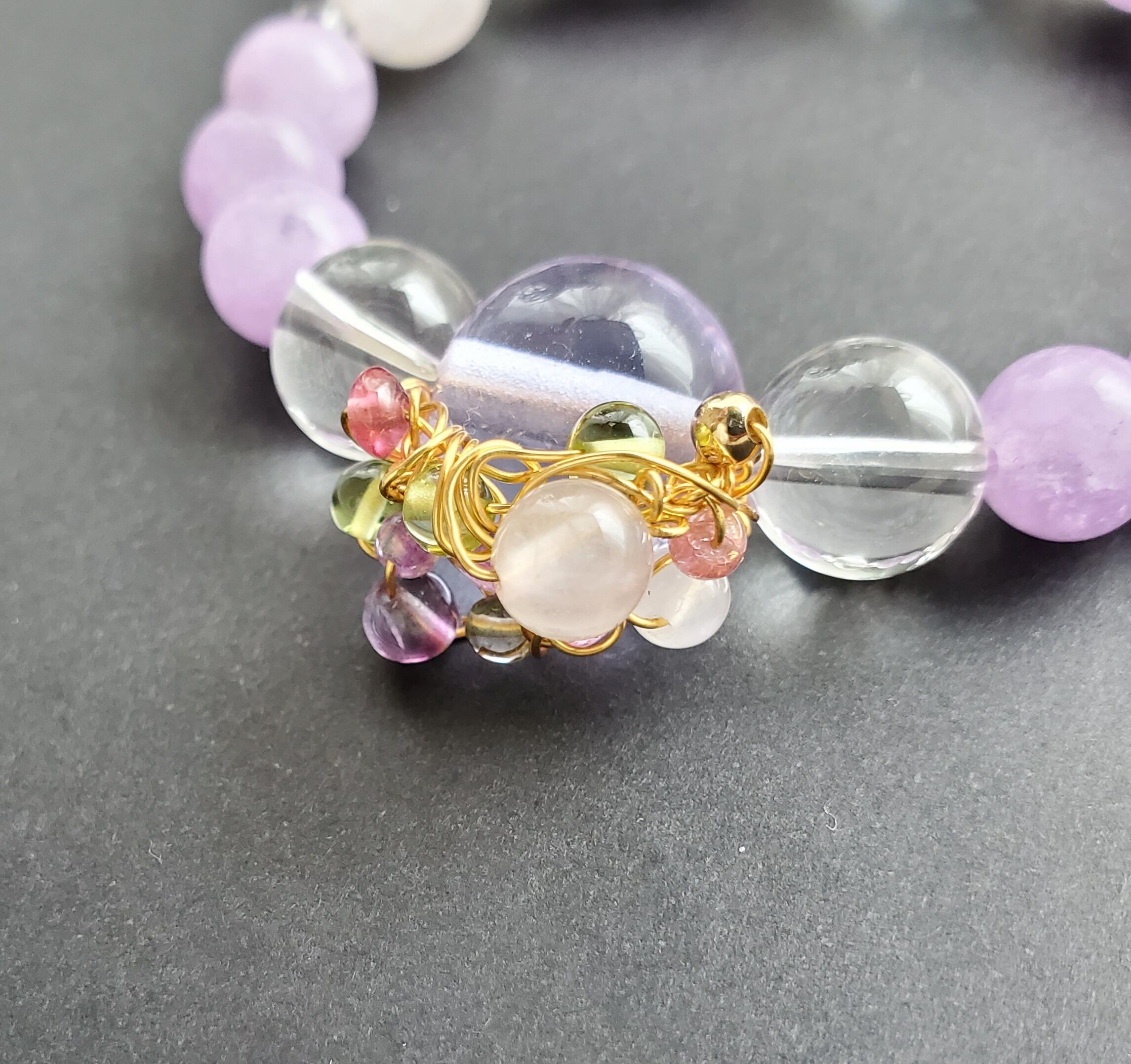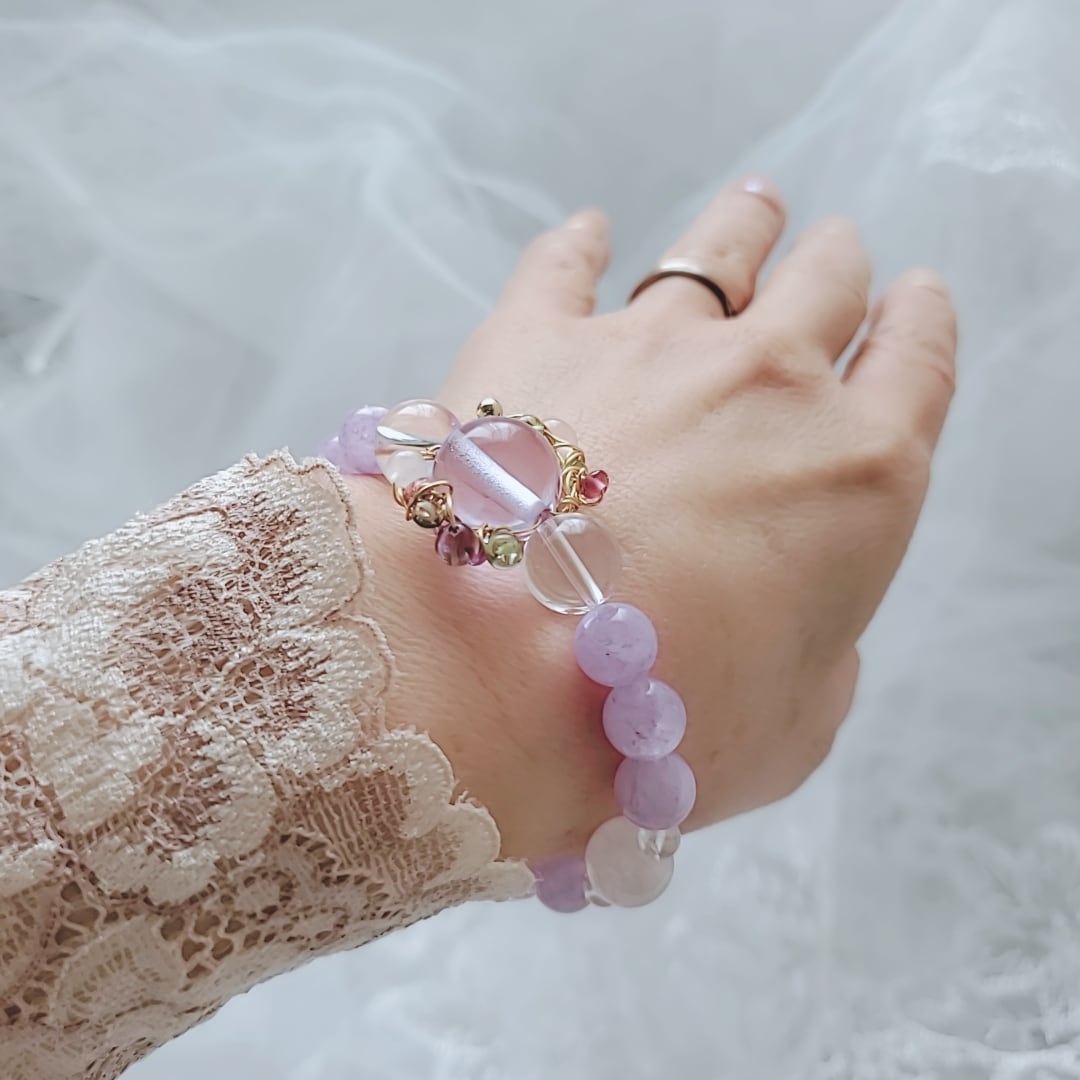 ラベンダー色のアンダラクリスタルにワイヤーアートで丁寧にデコレーションした一粒は、まるで小さな花束のよう。その繊細な美しさが、あなたの女神性をそっと呼び覚まします。