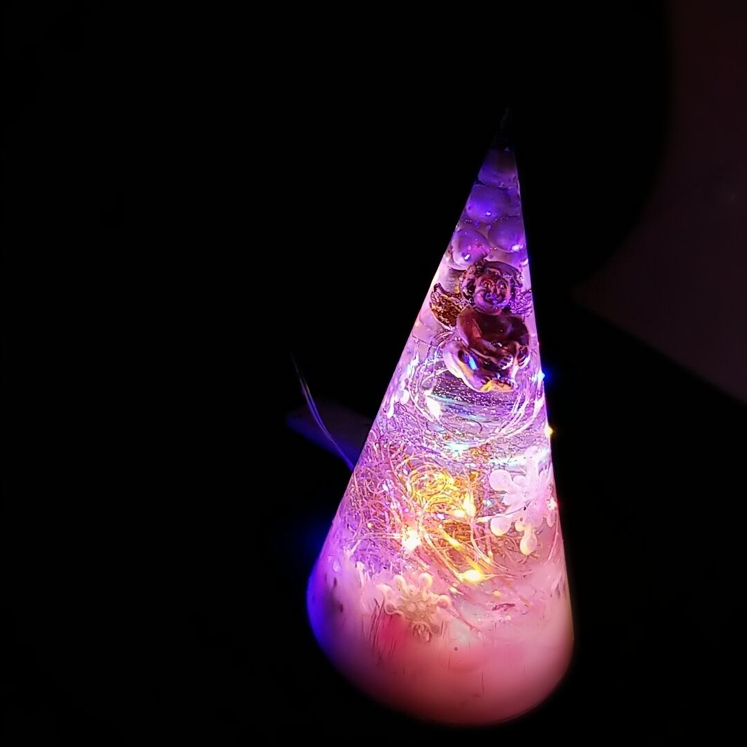 オルゴナイトのライトになります。スイッチを入れると美しい7色のカラフルな光を放出します。明るいところや照明の下では反射によりクリアカラーから虹色やオーロラカラーを生み出します。二つの相反する世界をお楽しみください。いつまでも眺めていたくなるそんな癒し力の高いオルゴライトです。電池式なので どこででも点灯できます。お部屋や玄関、イベントやサロンやショップに。
