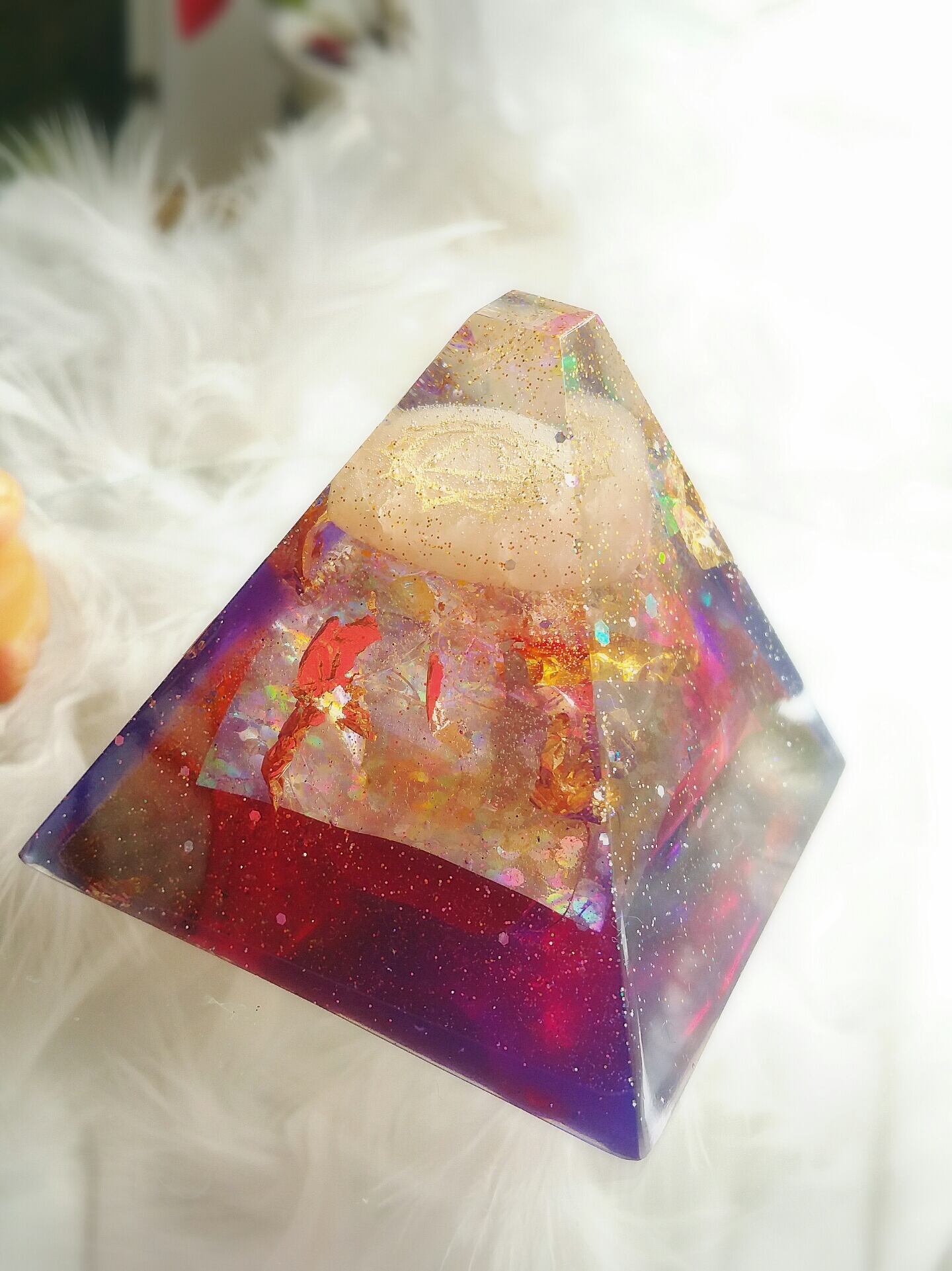 あらゆる角度から色やトーンが違って見える魅力的なオルゴナイトです。第3チャクラのシンボルが彫られたイエローカルサイトをセットしました。潜在的能力、才能 を呼び覚まします。またプラス面やマイナス面のあらゆる自分自身をポジティブに受け入れて成長していくことをサポートします。