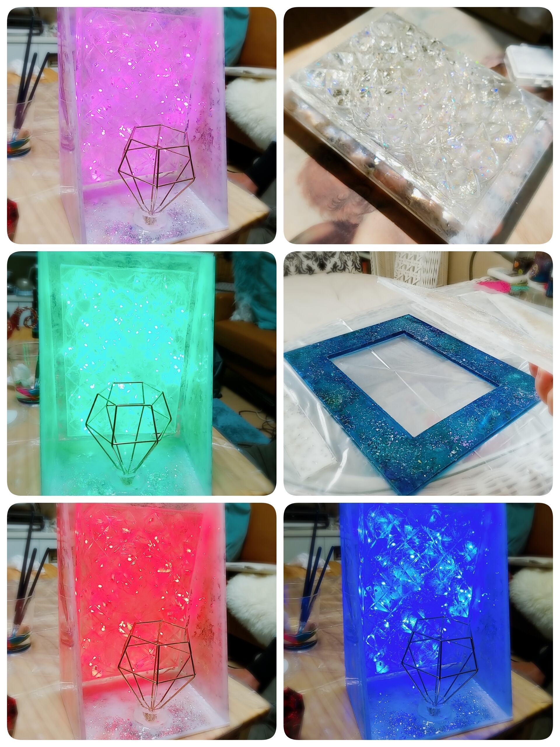 ライトをつけると付属のリモコンで6色の色合い(赤・紫・グリーン・ホワイト・ピンク・ブルーにランダムに発光パターンも操作できます)枠もすべてオルゴナイトにしています。