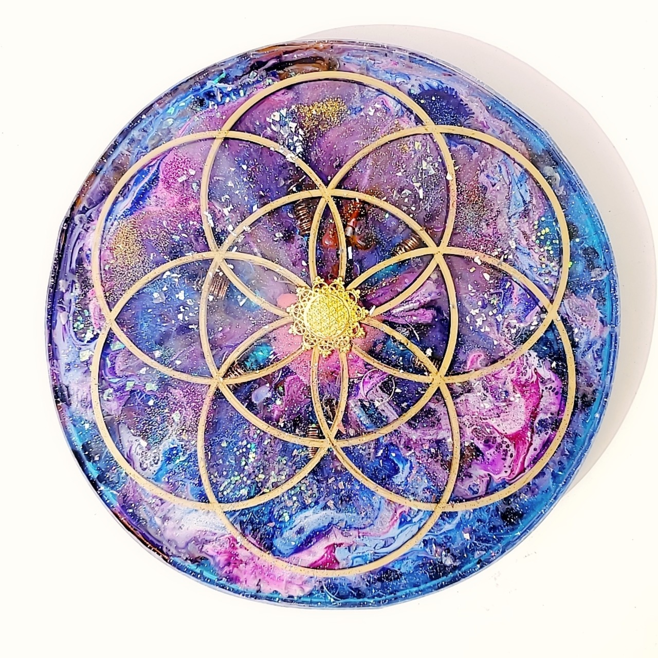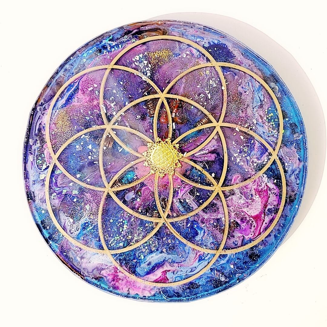 形、シンボル、エネルギーにこだわった作品です。4種の金属チップをセット。フラワーオブライフのいくつもの中心点に水晶6mm珠を37個セット。中央には周波数の高いフランキンセンスの天然樹脂の塊、3種の金属チップをセット。また 6つの円に向かって 6方向に水晶のポイント銅線巻きをセットしパワーグリットを作っています。顔が隠れるくらいの大きなパワフルなトレイです。