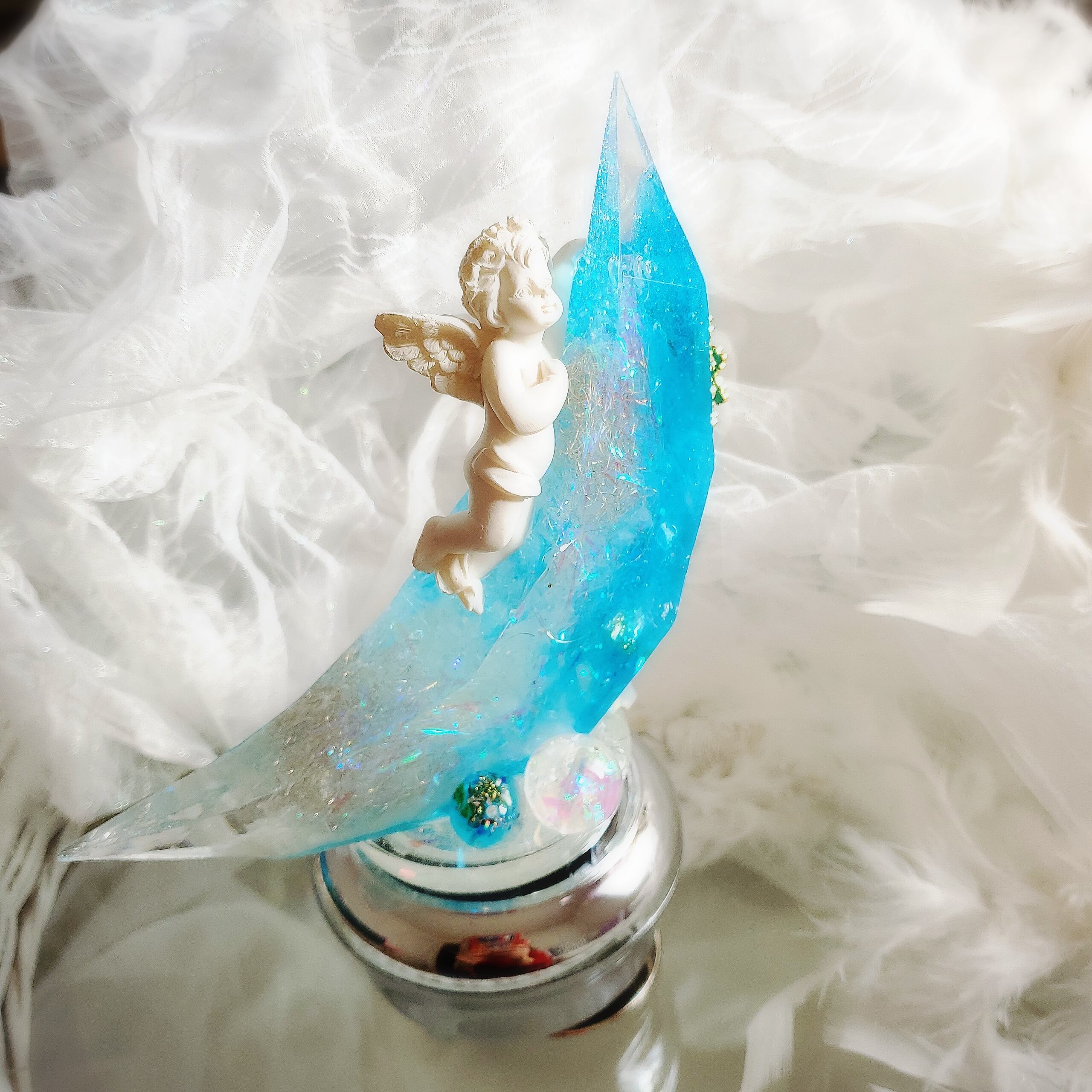 オルゴナイトのなかには水晶とムーンストーンが入っています。三日月のオルゴナイトは型から手作りしております。ライトアップもされとても美しいオルゴナイトです。