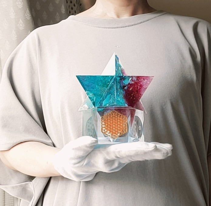 マカバは、図面を起こし、一枚ずつ型紙を手作業で組み立てた一点もの。1次元から3次元へと立体化するプロセス、さらに出来上がったマカバで瞑想することで4次元以上へアクセスすることが出来る、まさにエネルギーシフトの神聖幾何学オルゴナイトです。