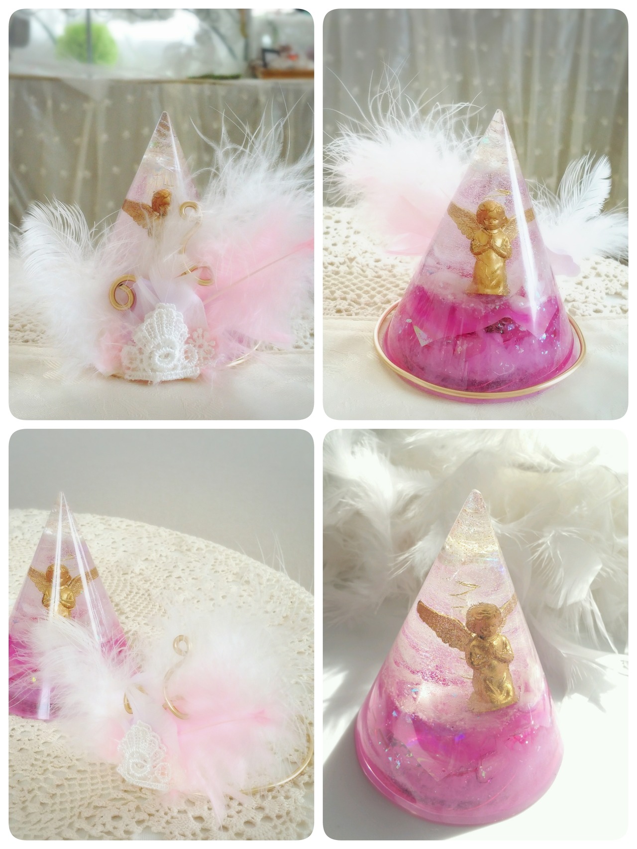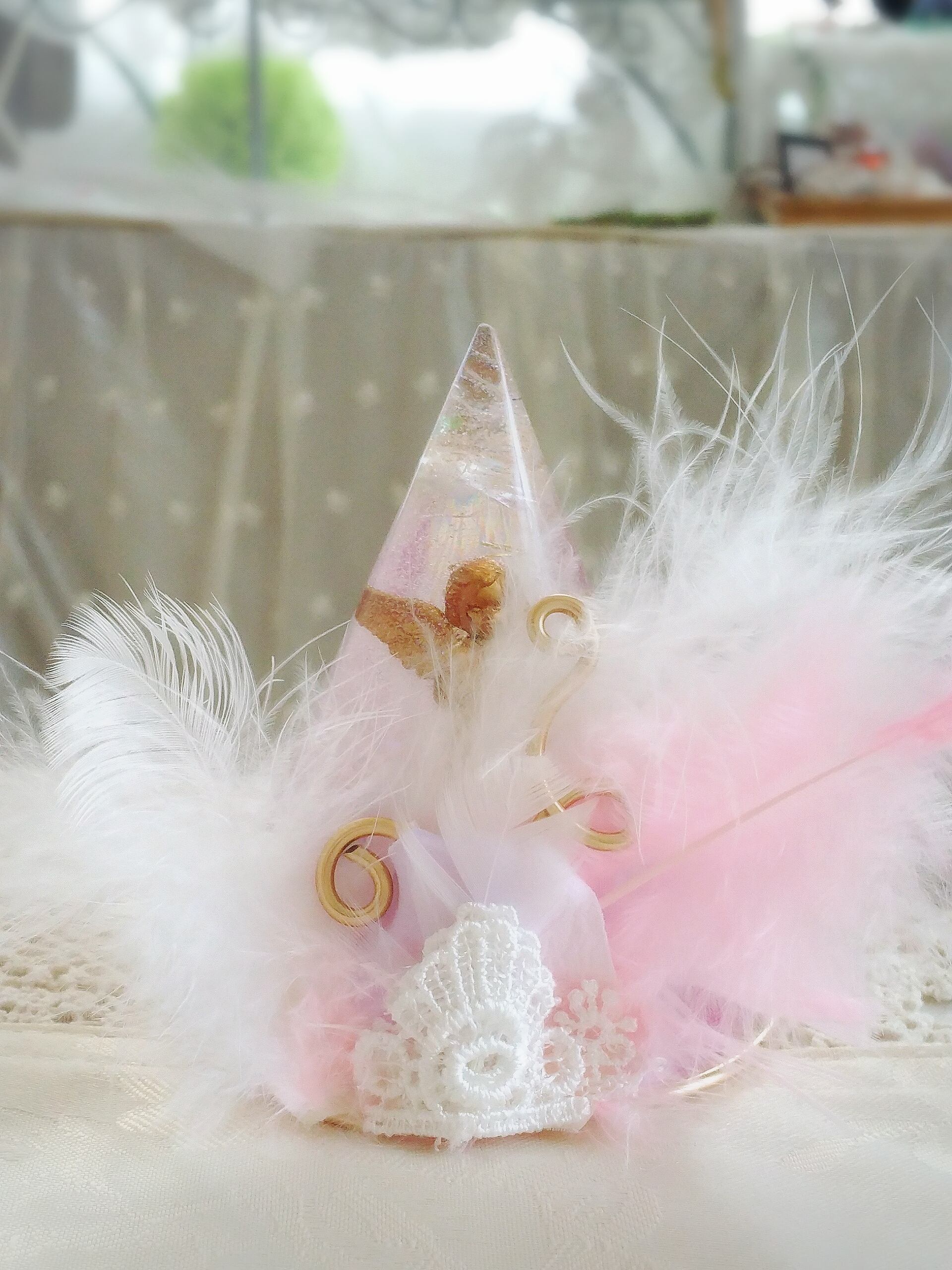 外すとシンプルな円錐のオルゴナイトになります。後ろに回転させ羽根を覗かせることもできますし お持ちのオルゴナイトや クリスタルにセットしてもお使いいただけます。羽根は天使とのつながりの意識を高め 軽やかさや 癒しのエネルギーをもっています。