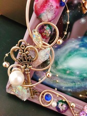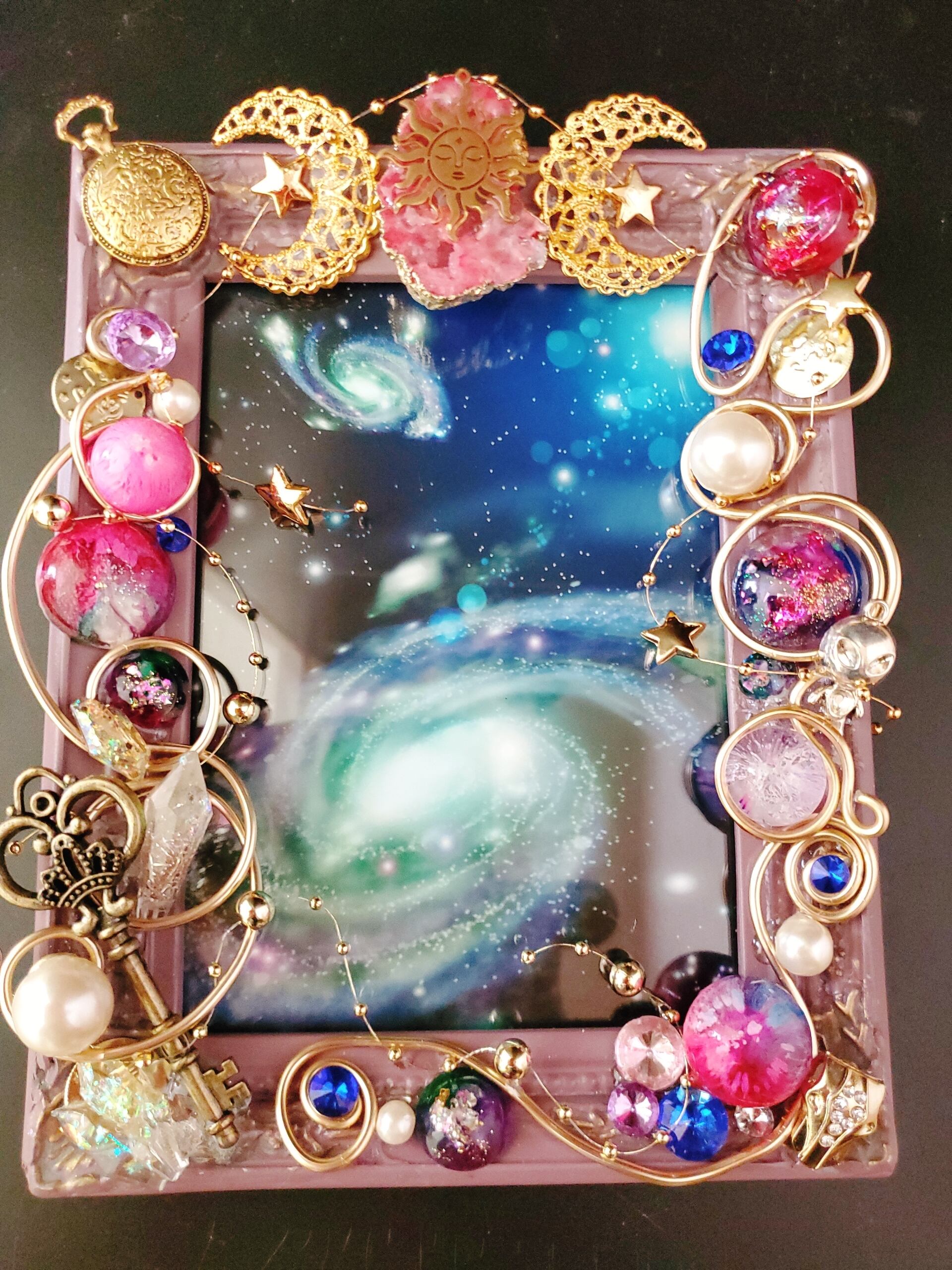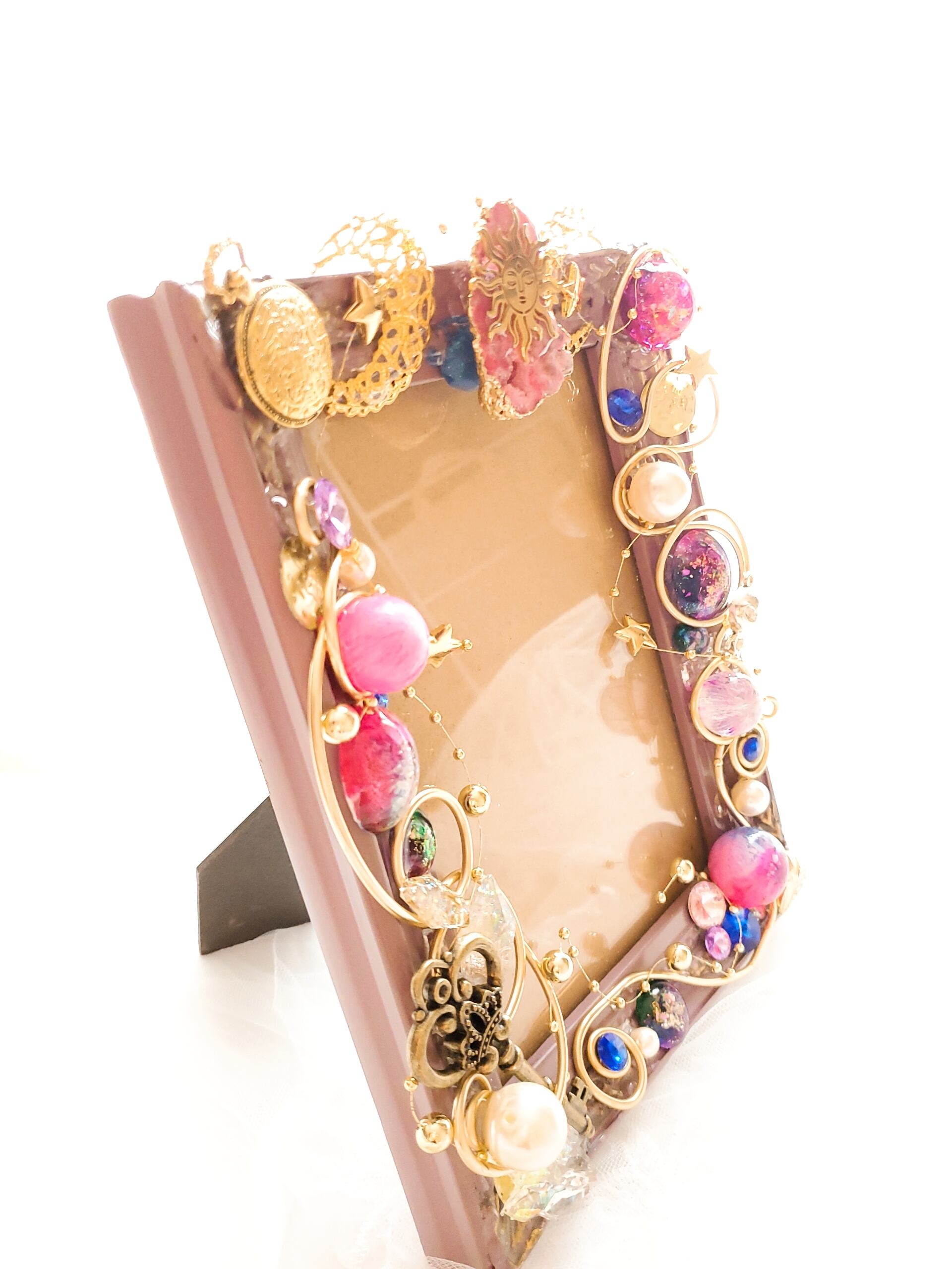 フレームの周りにオルゴナイト、天然石、魔法のチャーム、レジンアートをワイヤーでデコレーションしました。フレームの中に入れる画像のイメージの引き寄せを加速させてくれるでしょう。お部屋やサロン、ショップなどにに好きなものを入れて飾ってください。お部屋のエネルギーを明るく楽しく変換します。あなたの周りを好きなもので埋め尽くしましょう。