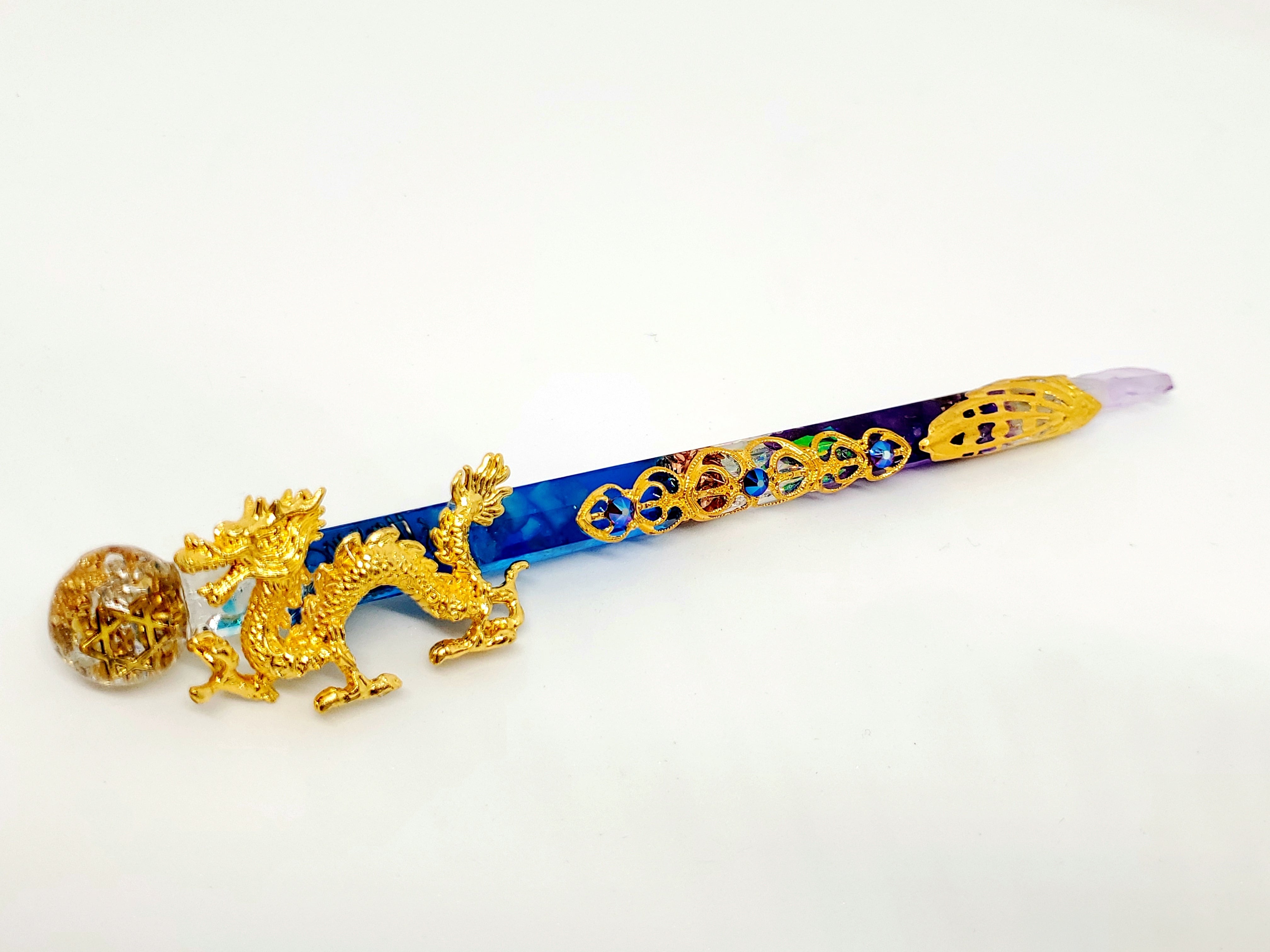 水晶に錬金術が施されたラベンダーオーラのクリスタルポイントで作製した龍使いのオルゴナイトワンドです。ホルダー部分のオルゴナイトは水晶ポイント銅線巻き、アメジスト、ラリマーのチップが入っています。