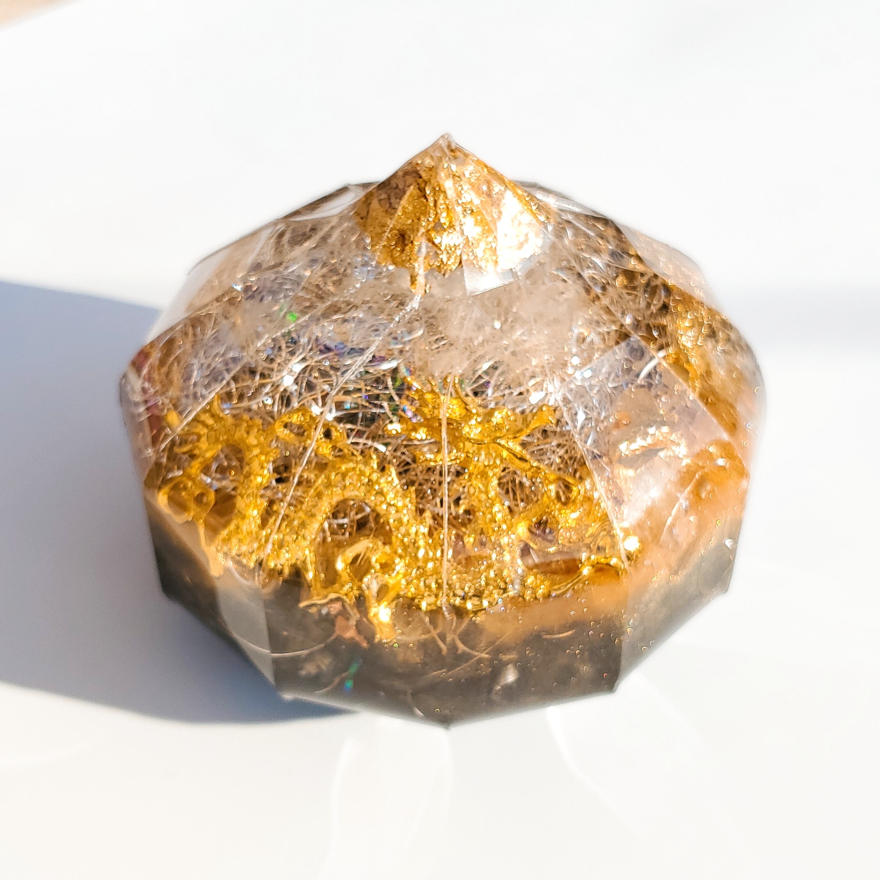 型は図面を起こし型紙をクリアシートで作りテープで繊細に張り合わせて1次元から3次元の立体になるまでを楽しんで作製しております。型は一度しか使えないその時にだけ生まれる貴重なエネルギー場になります。龍神舞う宝珠のオルゴナイトをお祈りに瞑想に、また豊かさや夢実現に向かってサポートするように意図したり、宇宙からのエナジーを受け取るアンテナにお使いください。使い方はあなた次第 自由に宇宙にコマンドしてください。