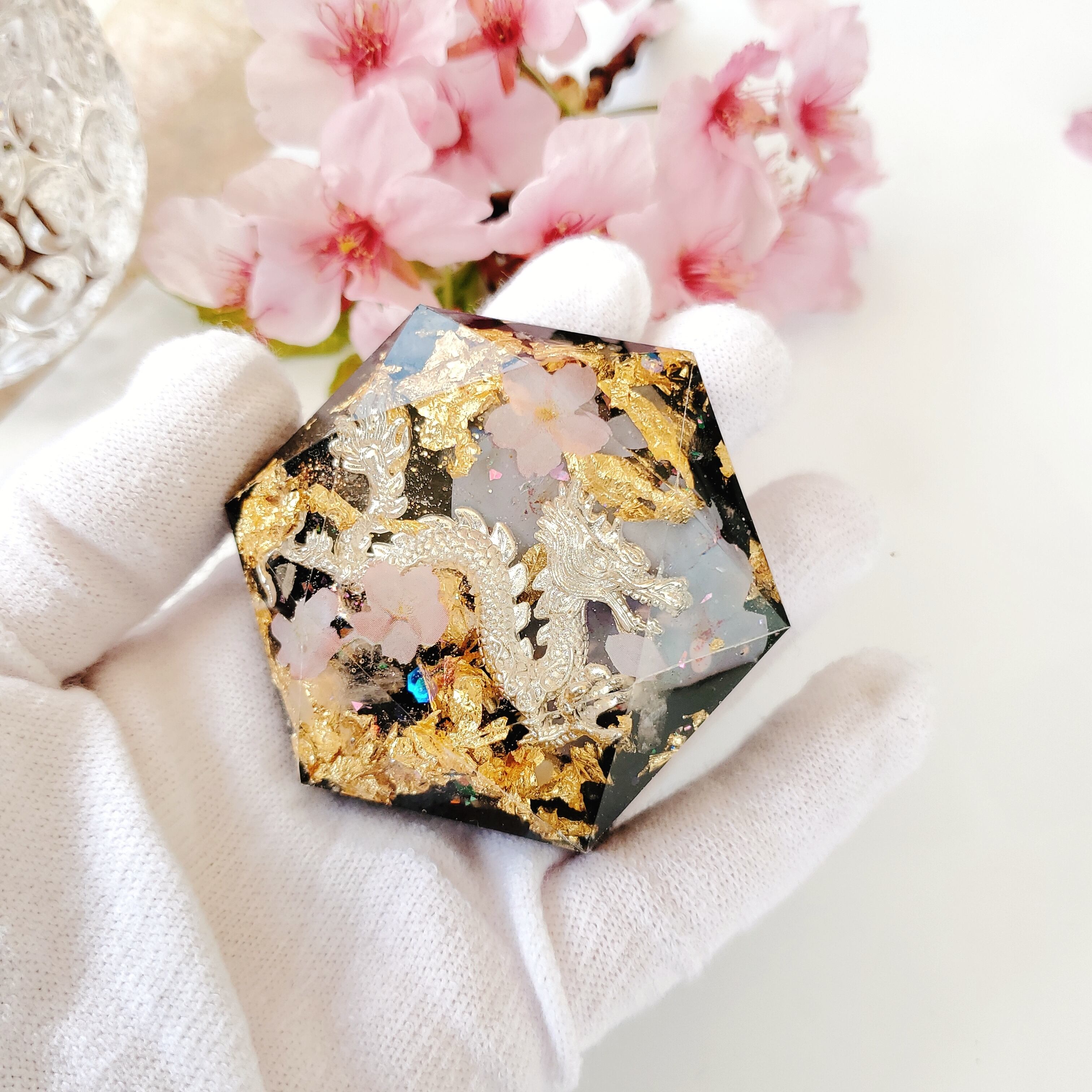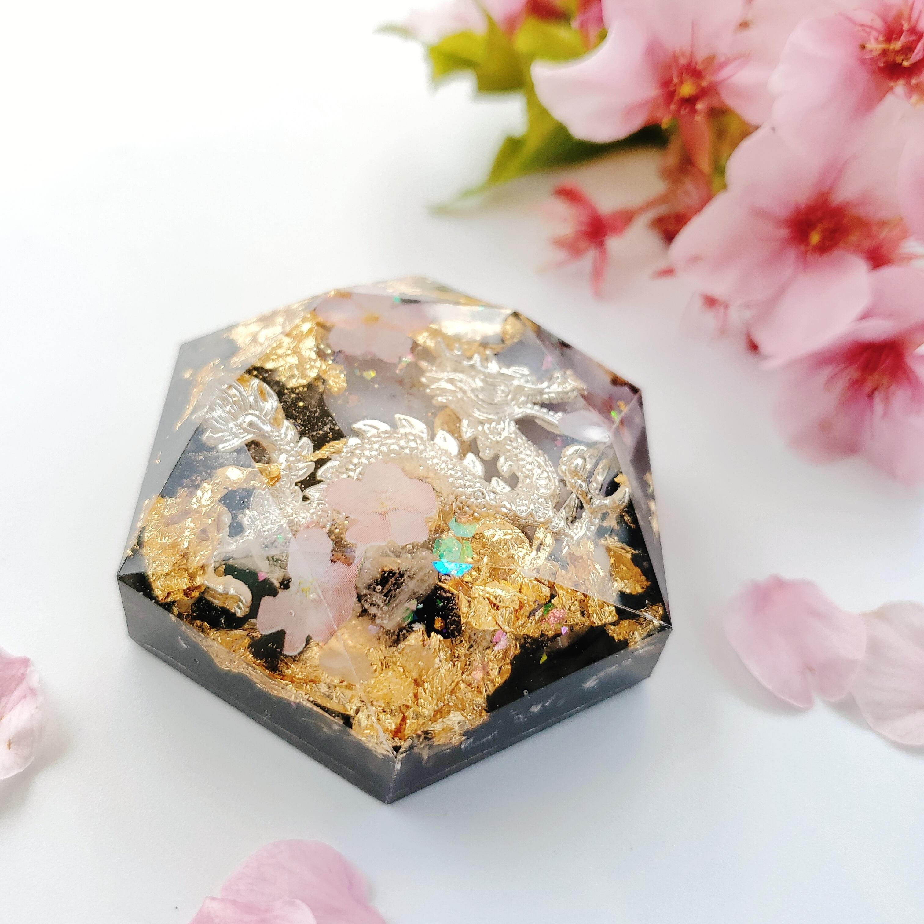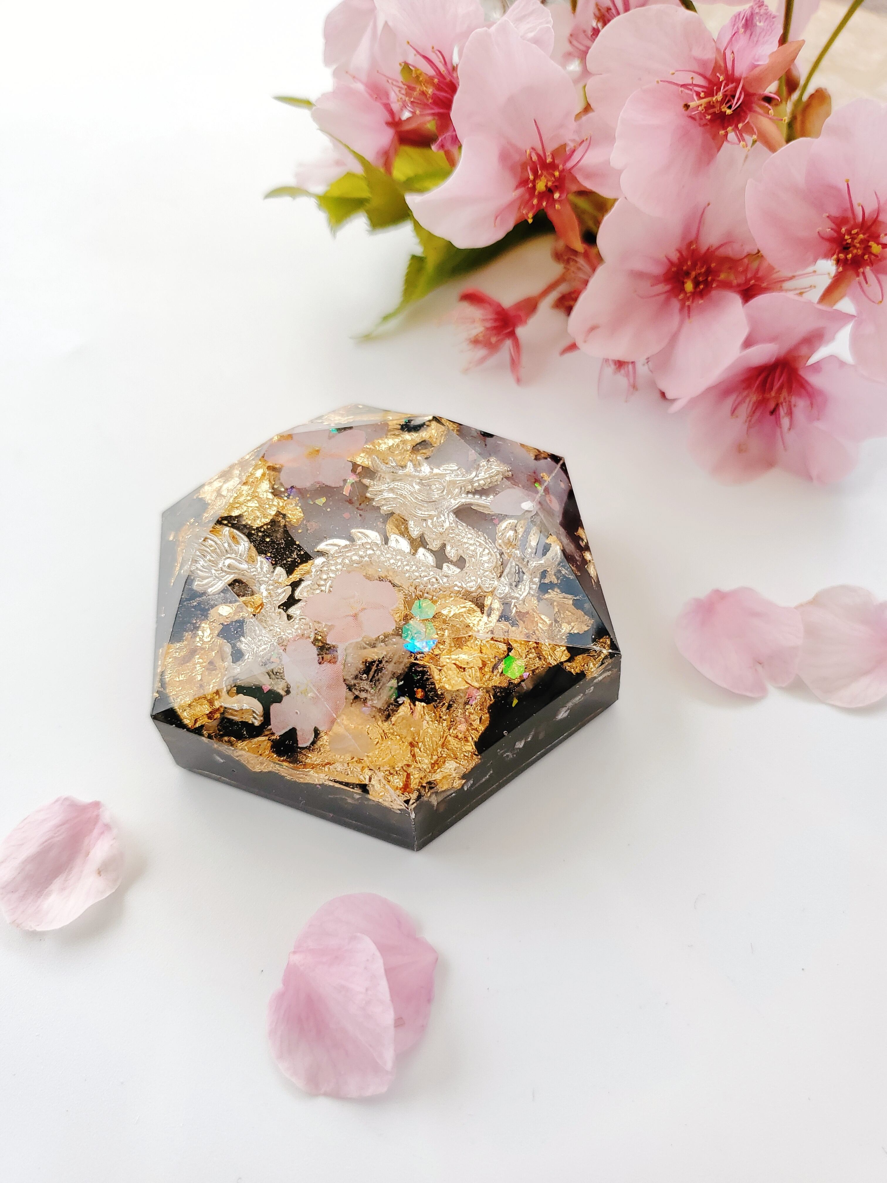 六芒星のカットが入った六角形の型を手作りしゼロから作製しております。桜(コノハナサクヤヒメ)と龍神のオルゴナイトです。着色剤の黒でなく麻炭で黒い色をだしています。麻炭は不要なものを包み込みデトックスしていきます。こちらはエネルギー浄化や魔除けなど守護オルゴナイトとしても最適なパワフルなオルゴナイトになっています。桜色のピンクのもつ無限の愛のエネルギーと愛の石ローズクォーツ、豊かさをそして健康を呼び込むオレンジカルサイト 願望成就のヒマラヤ水晶を六芒星オルゴナイトにこめています。