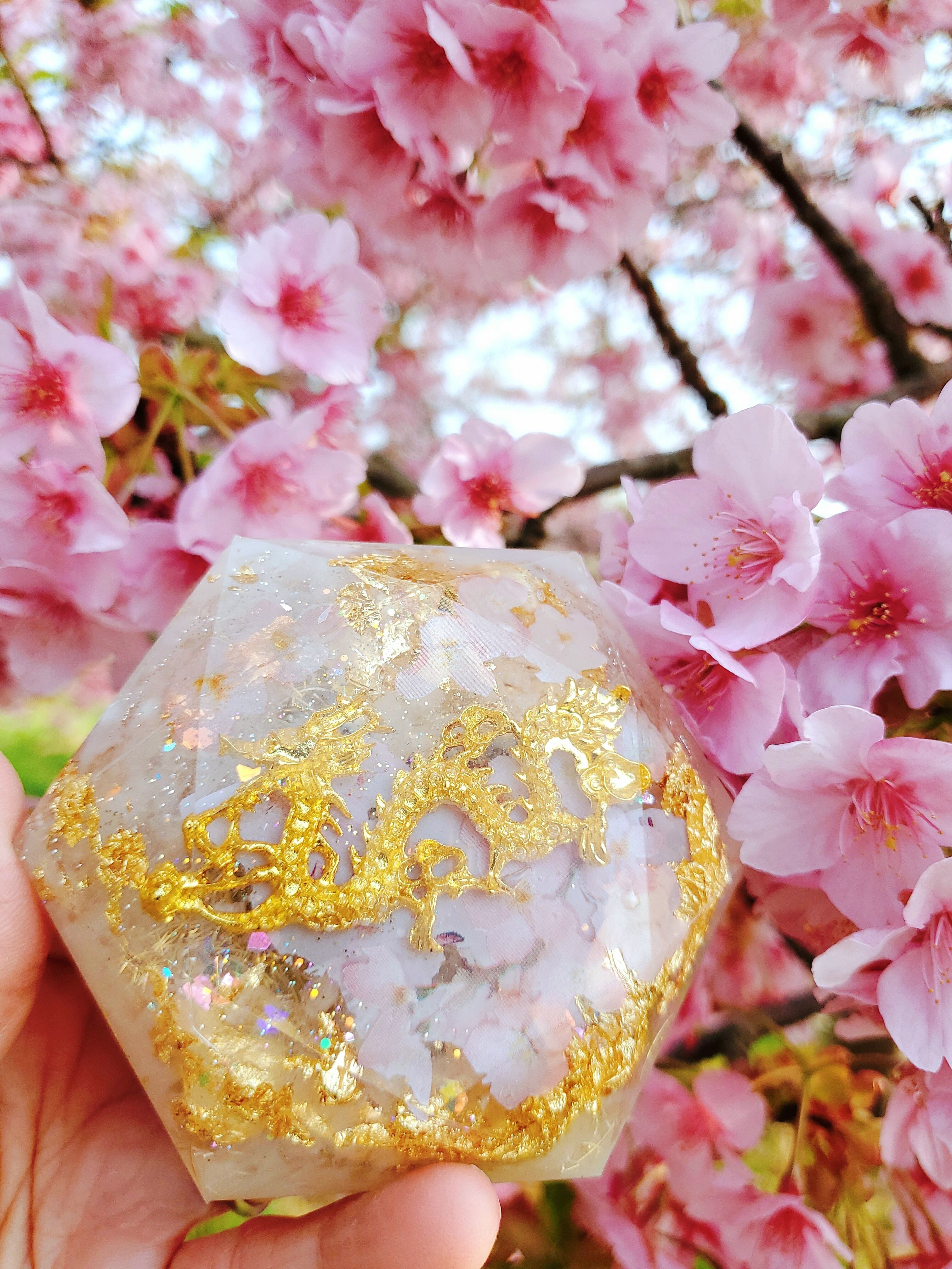 六芒星は本来の自分に目覚め進んでいくあなたをサポートする神聖幾何学模様です。桜が咲き乱れる天を舞う黄金龍がサポートするあなたの相棒となるオルゴナイトになるでしょう。