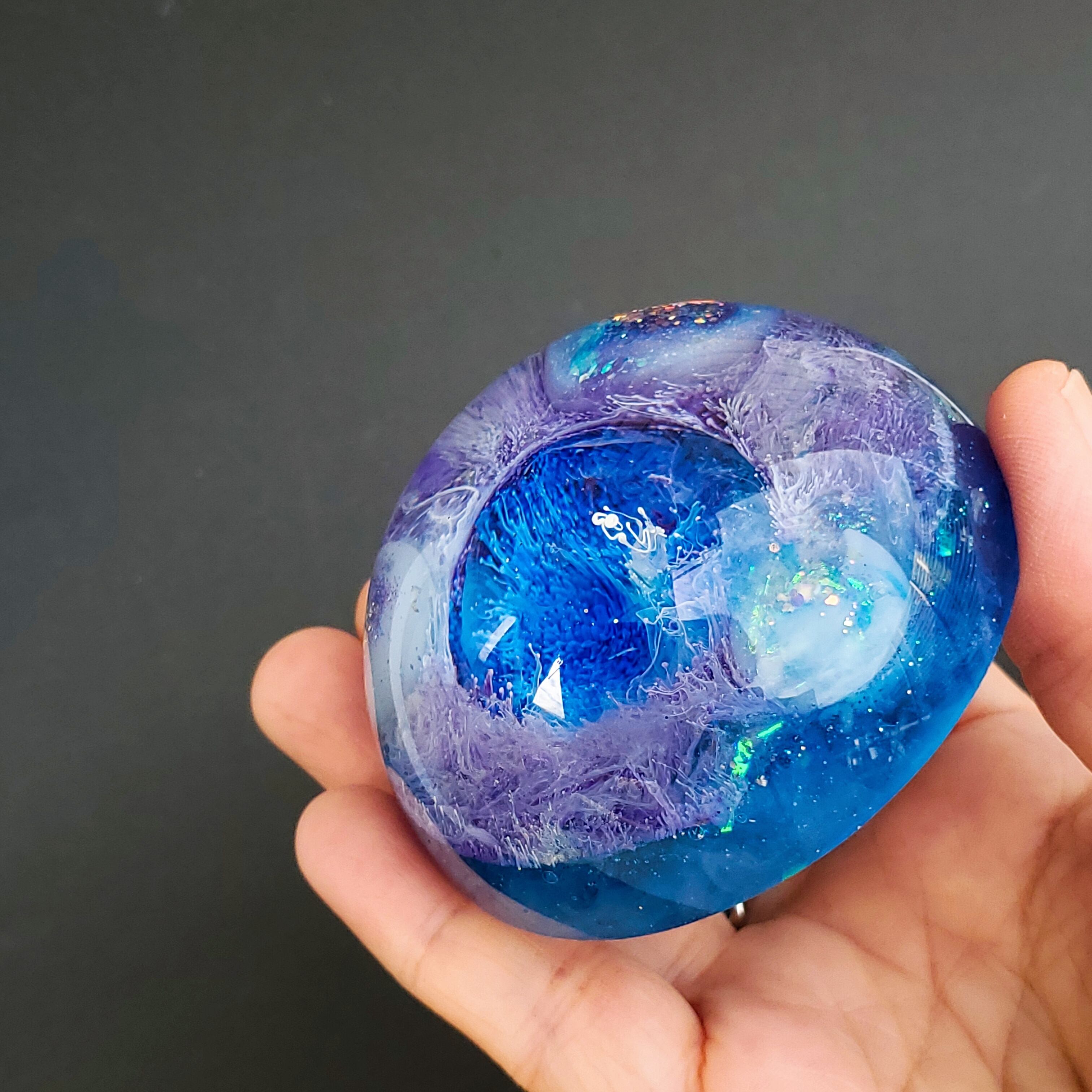 ドーム型のオルゴナイト。いつまでもずっと見ていられる不思議な仕上がりになりました。アクアマリン、ヒマラヤ水晶をたっぷり入っています。