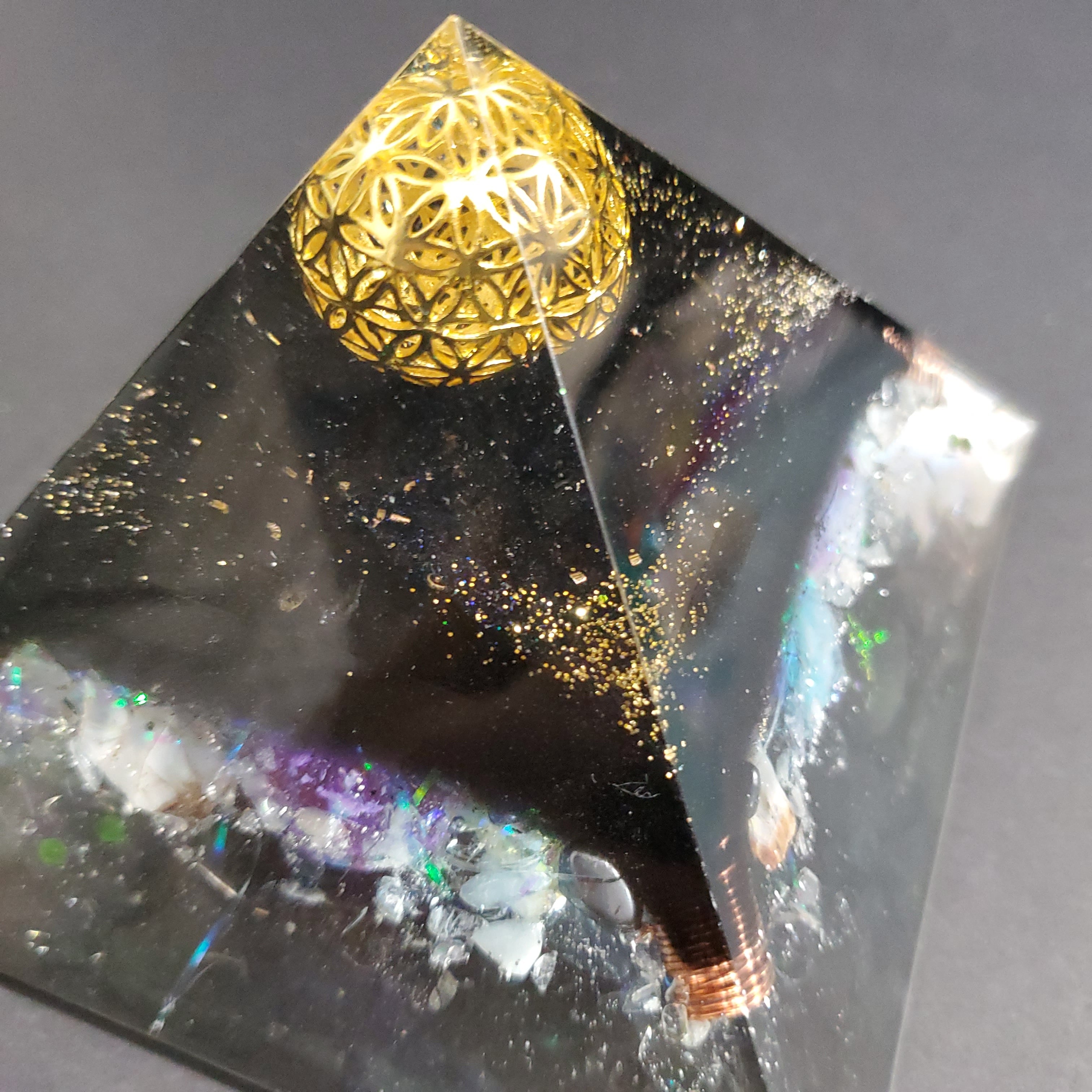 宇宙を表現するフラワーオブライフの球体を先端に ブラックの部分(麻炭パウダーで着色)には水晶のポイント銅線巻き、ブラックトルマリン、活性炭、ヒマラヤ水晶を敷き詰めています。4つのコーナーにもポイント水晶銅線巻きを設置しパワフルに製作。