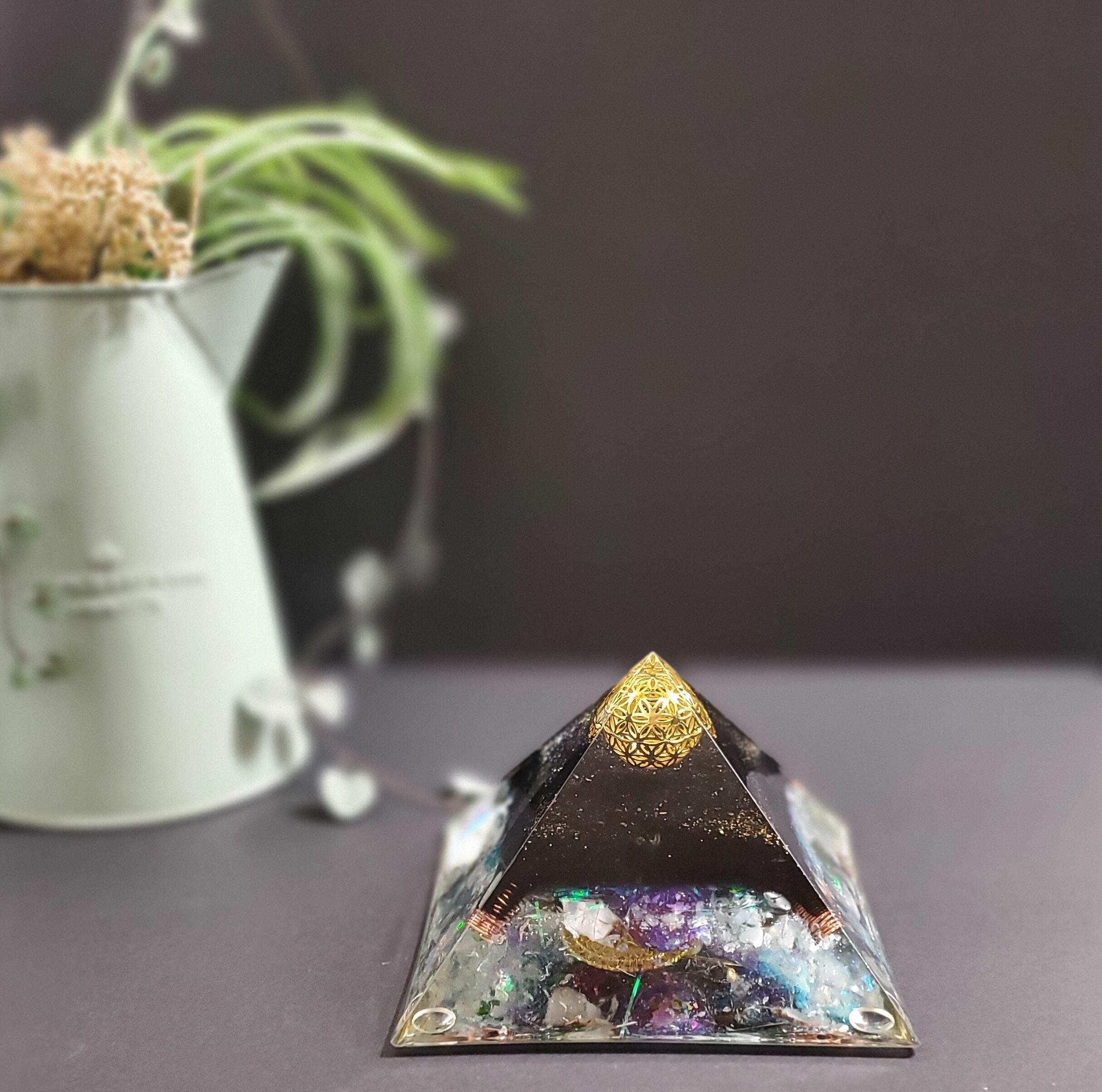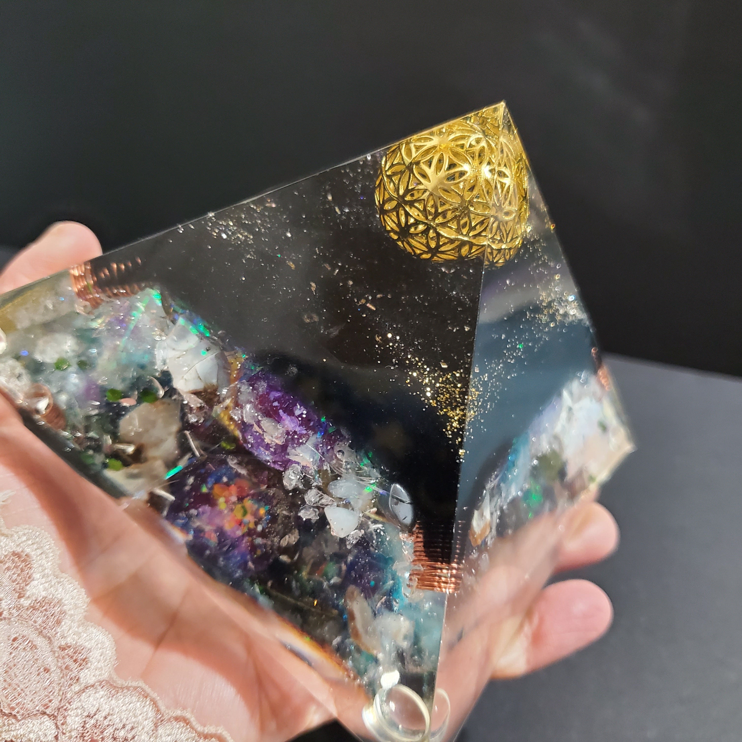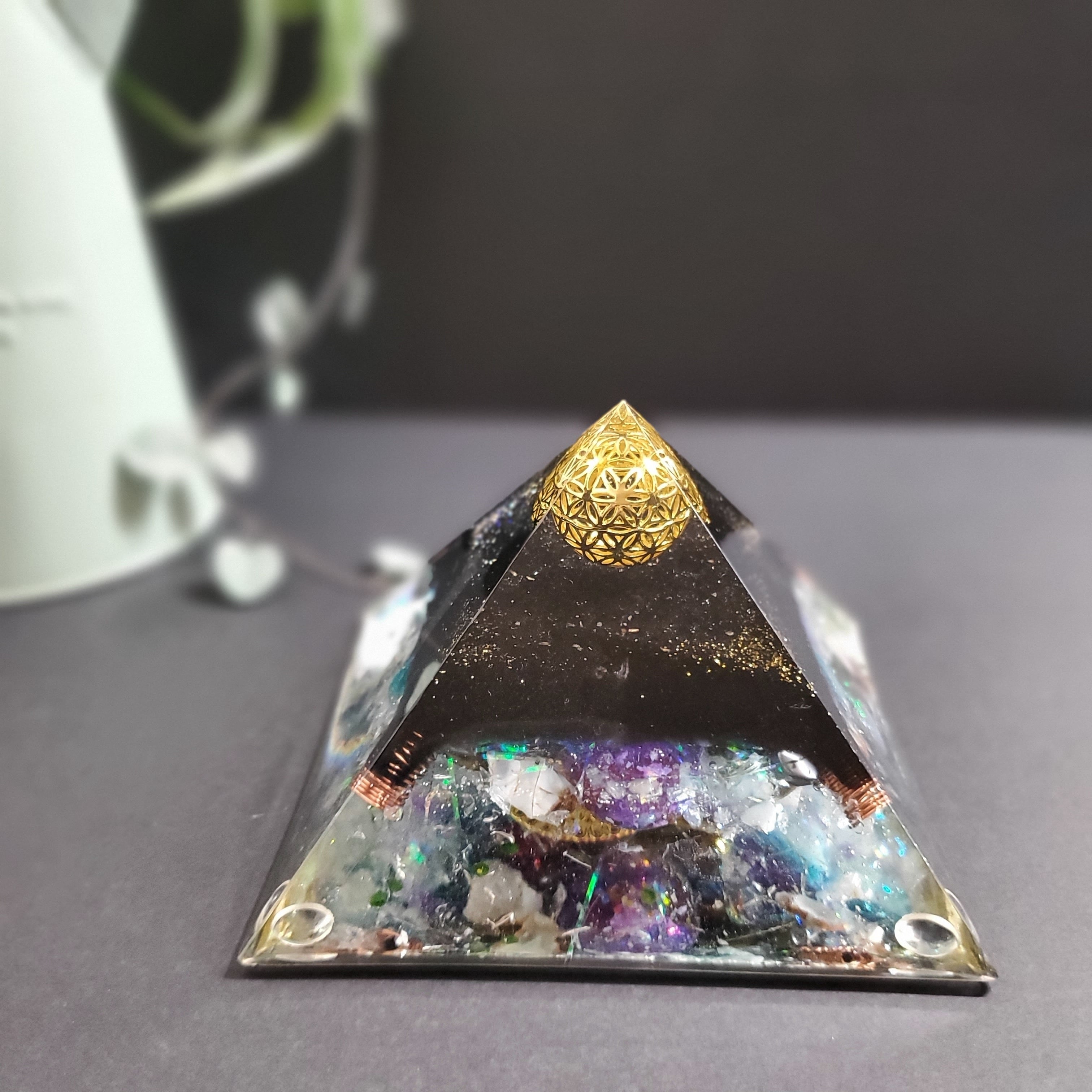 一番下に球体の美しいミニオルゴナイトを敷き詰め、神聖な光と水の美しい世界をイメージして作っております。見ていると瞑想状態に入り心が落ち着き軽やかになり希望が湧いてきます。ピラミッドを倒して底面を正面にして飾ることで新しい視点やエネルギーの流れを楽しめます。