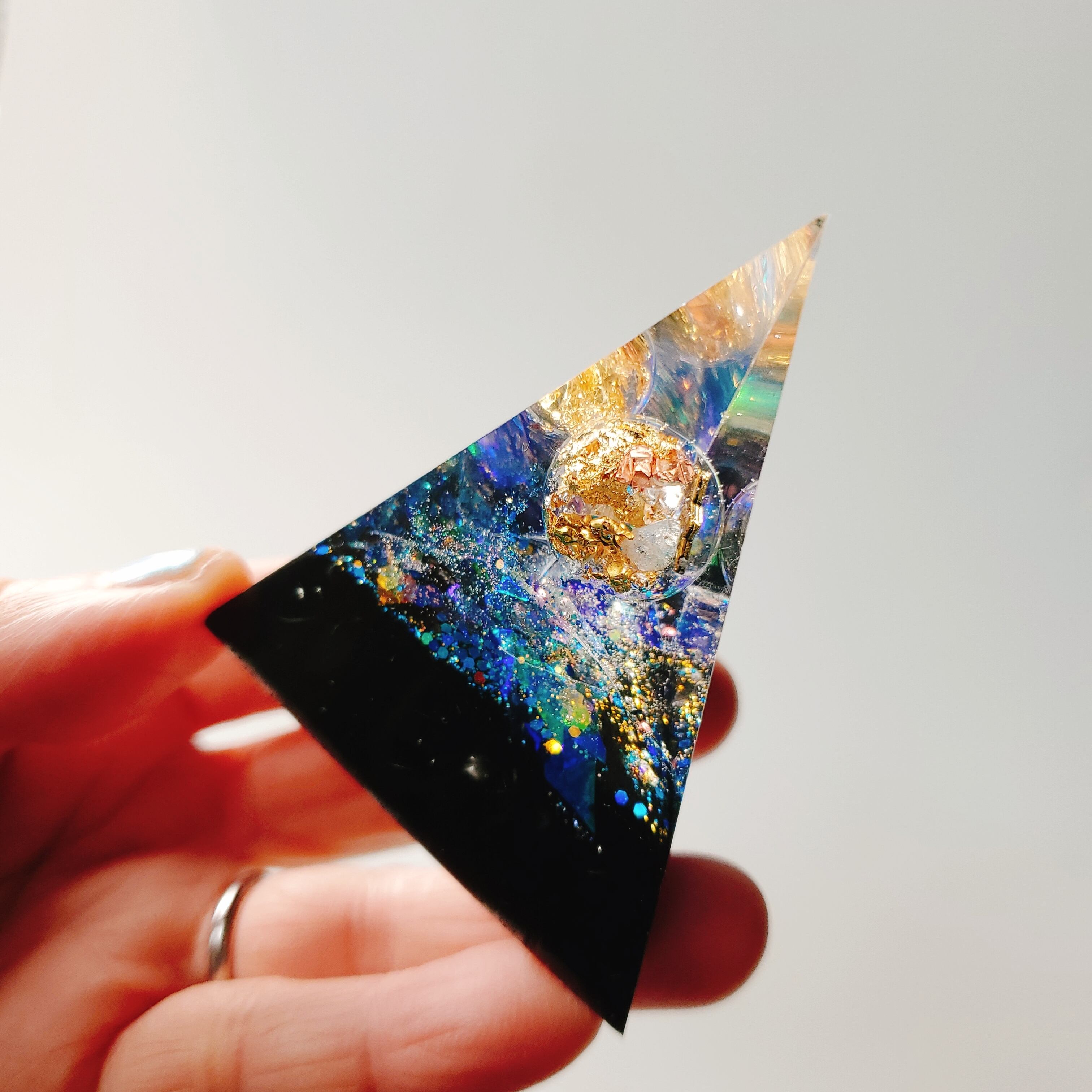 三角錐がもつシャープで美しい形の中に宇宙をイメージしました、中の惑星の球体のオルゴナイトには六芒星のシンボルと洋金箔が入っています。