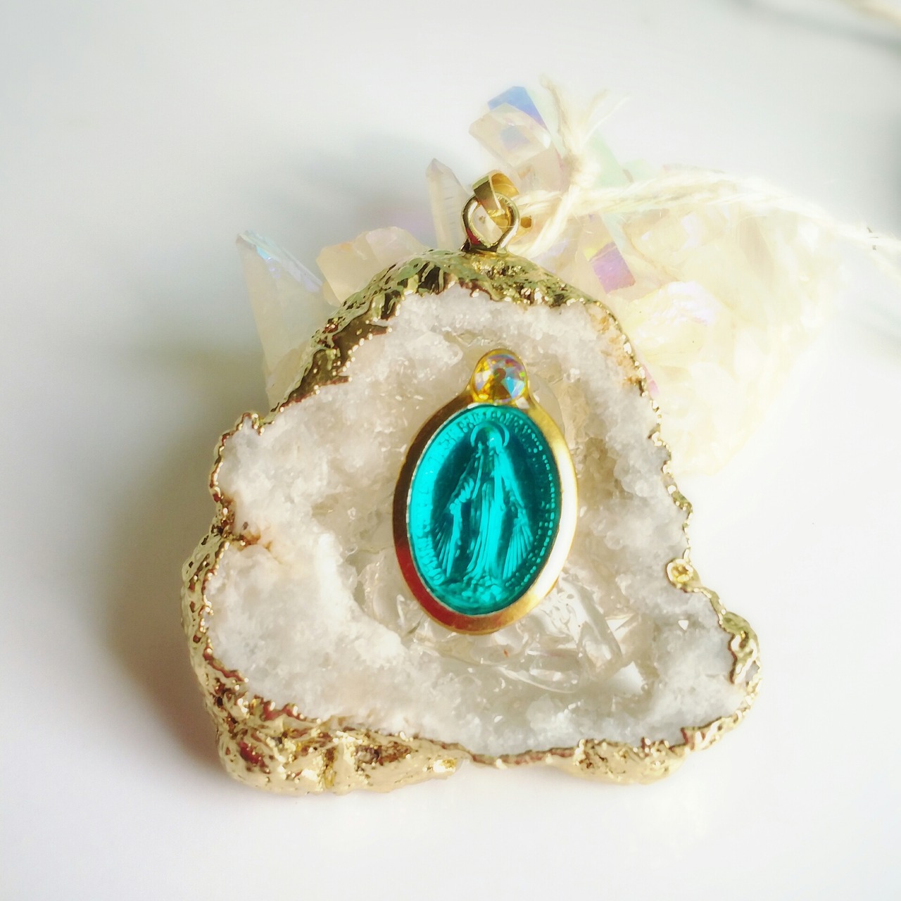 ジオードの結晶につつまれたマリア様のペンダントです。洞窟の周りにはクリスタルのチップを埋め込んでいます。心や感情、肉体の浄化に。 自分軸の確立 ありのままの自分の美しさ強さを呼び覚まします。変化を見守るマリア様の優しいエネルギーに包まれた美しいペンダントトップです。あなたのハートに光がたくさん入り込みますように。
